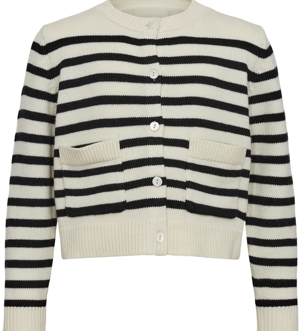 Skøn Sofie Schnoor cardigan i cremehvid med brede, sorte striber.