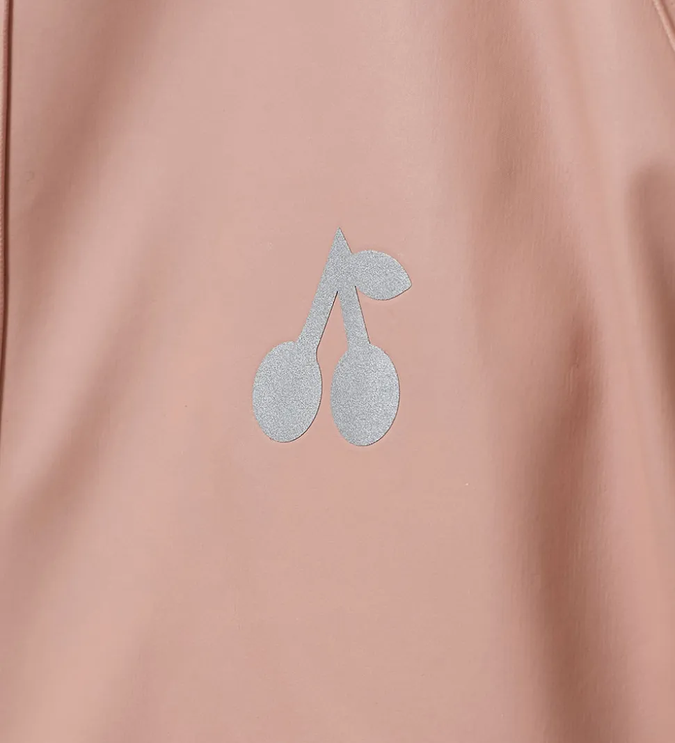 Skøn Sofie Schnoor flyverdragt af PU i rosa og med et refleksprint af kirsebær på brystet.