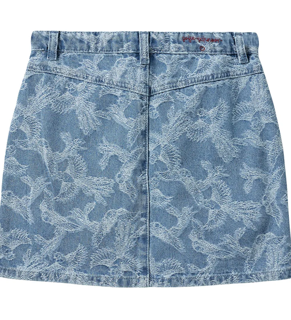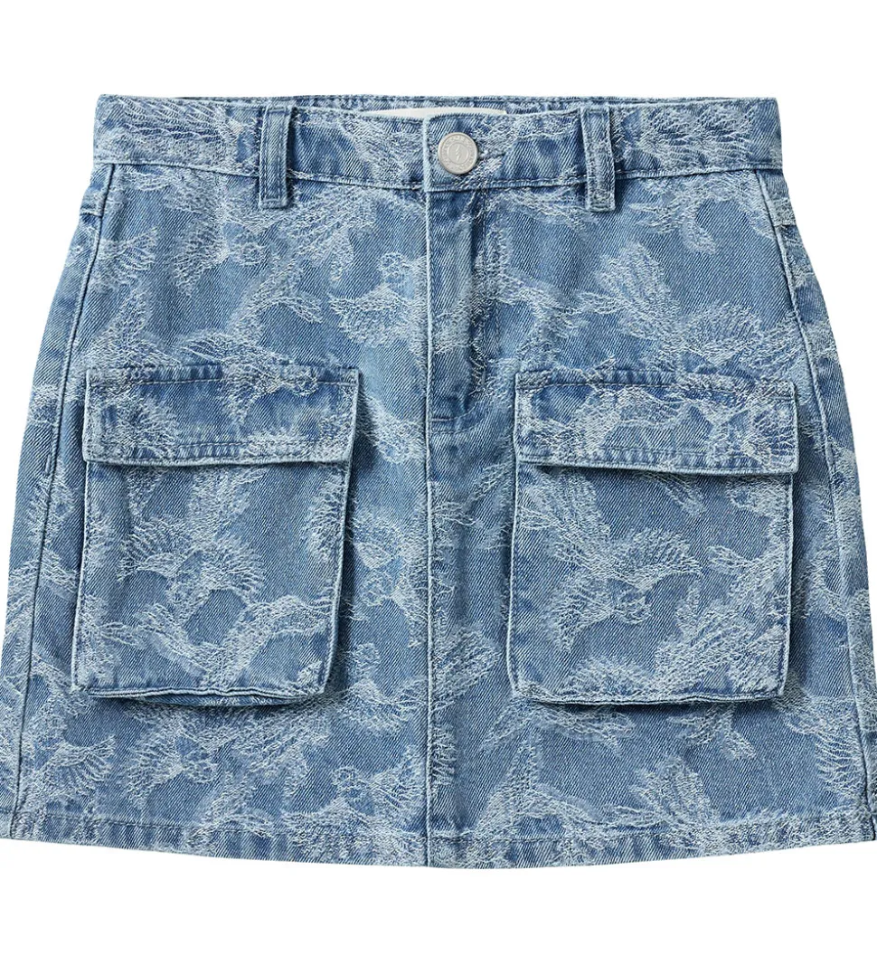 Lækker Sofie Schnoor nederdel i en lyseblå denim med et flot mønster af fugle. Nederdelen har praktiske lommer, der tilføjer funktionalitet. Ideel til en afslappet og smart stil.