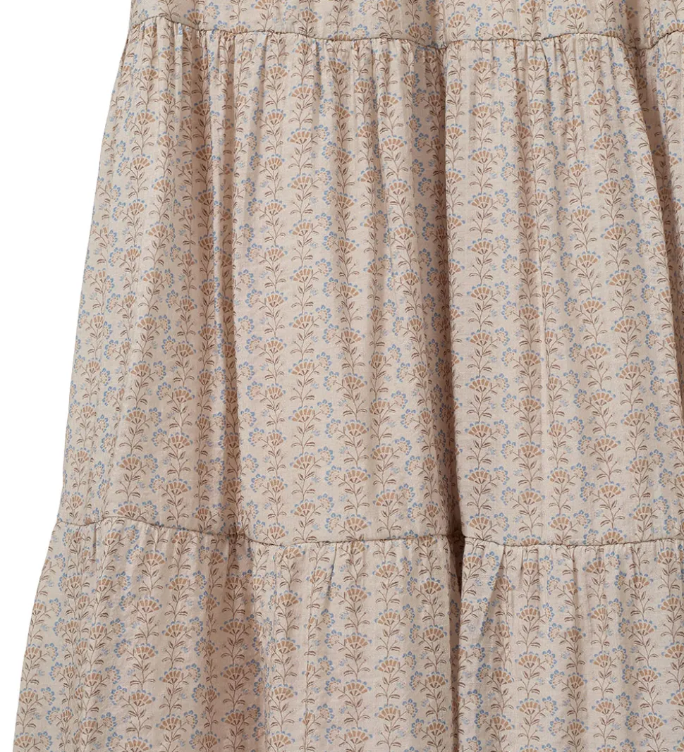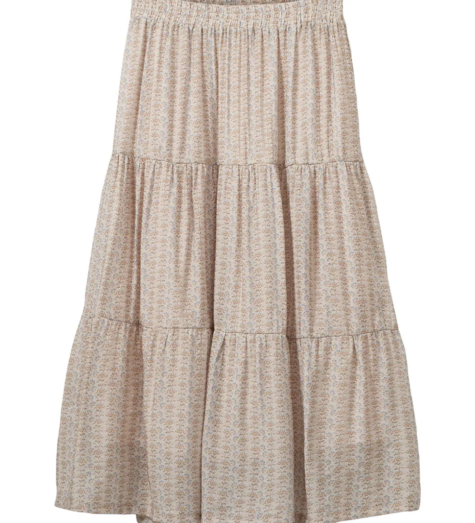 Skøn Sofie Schnoor nederdel i en afdæmpet beige nuance og med et allover blomsterprint i blå og brune nuancer.