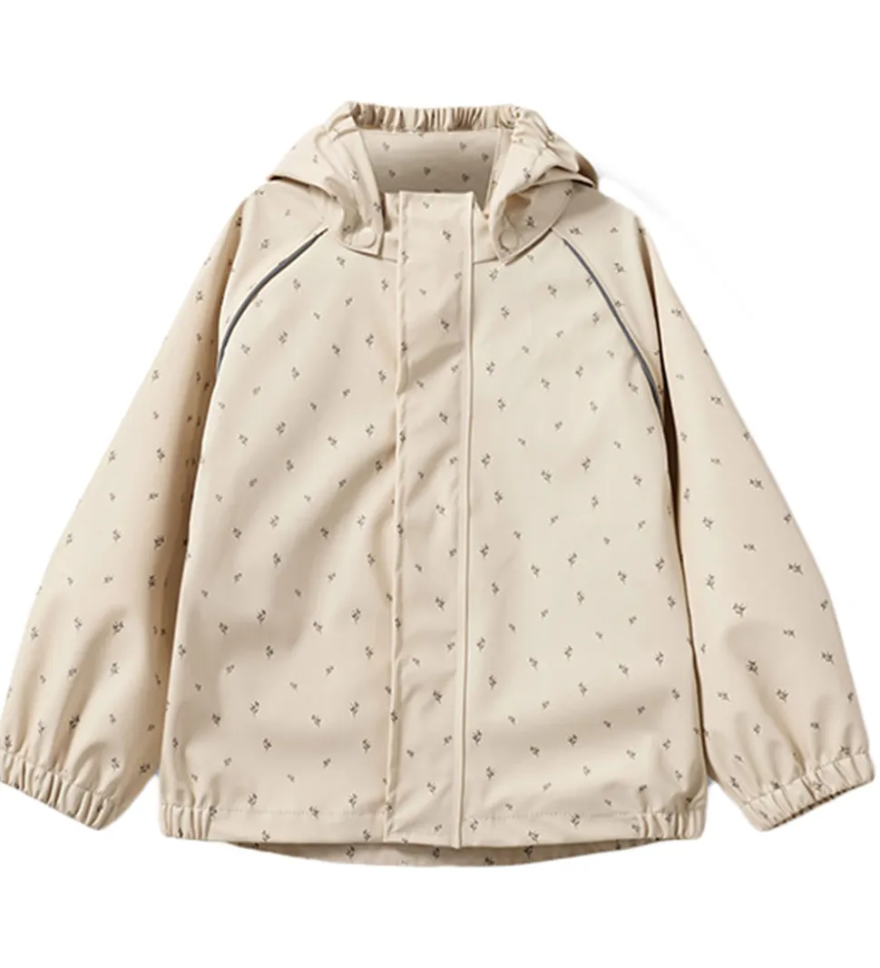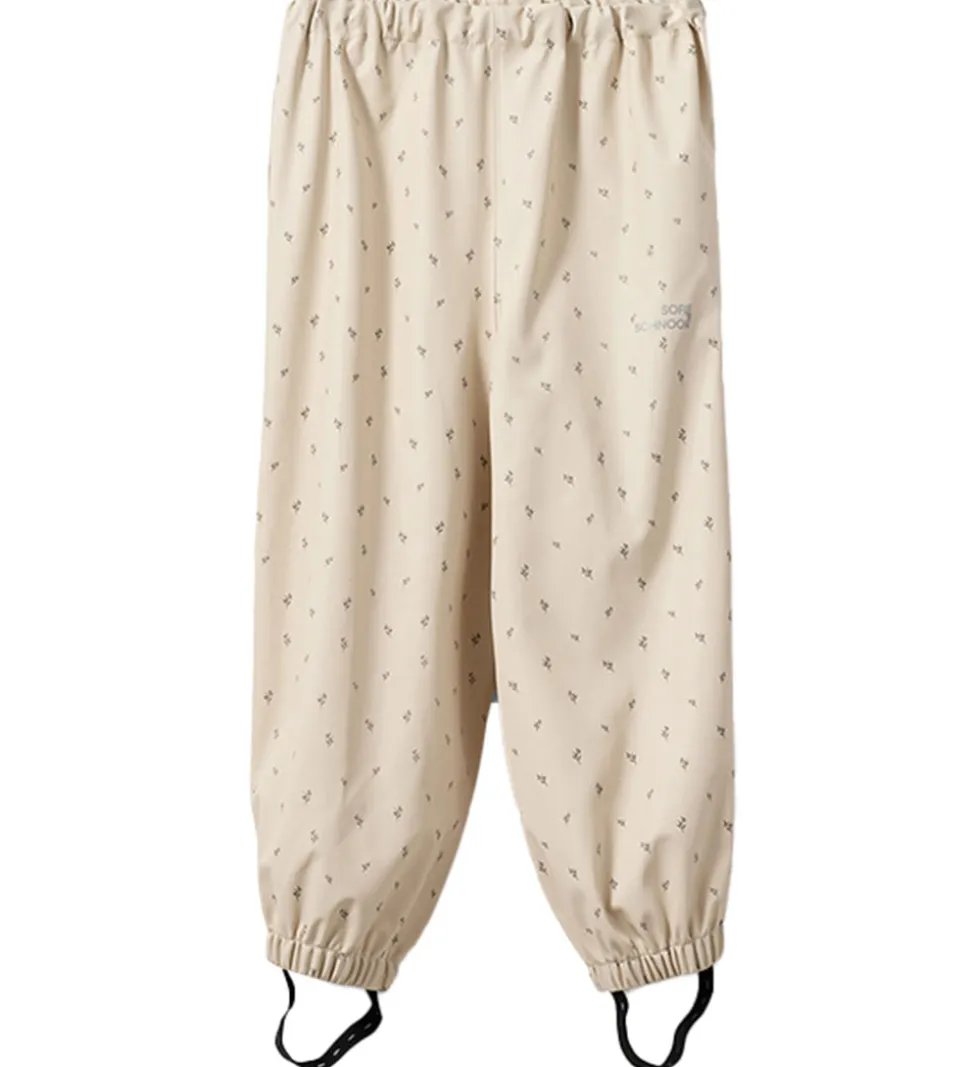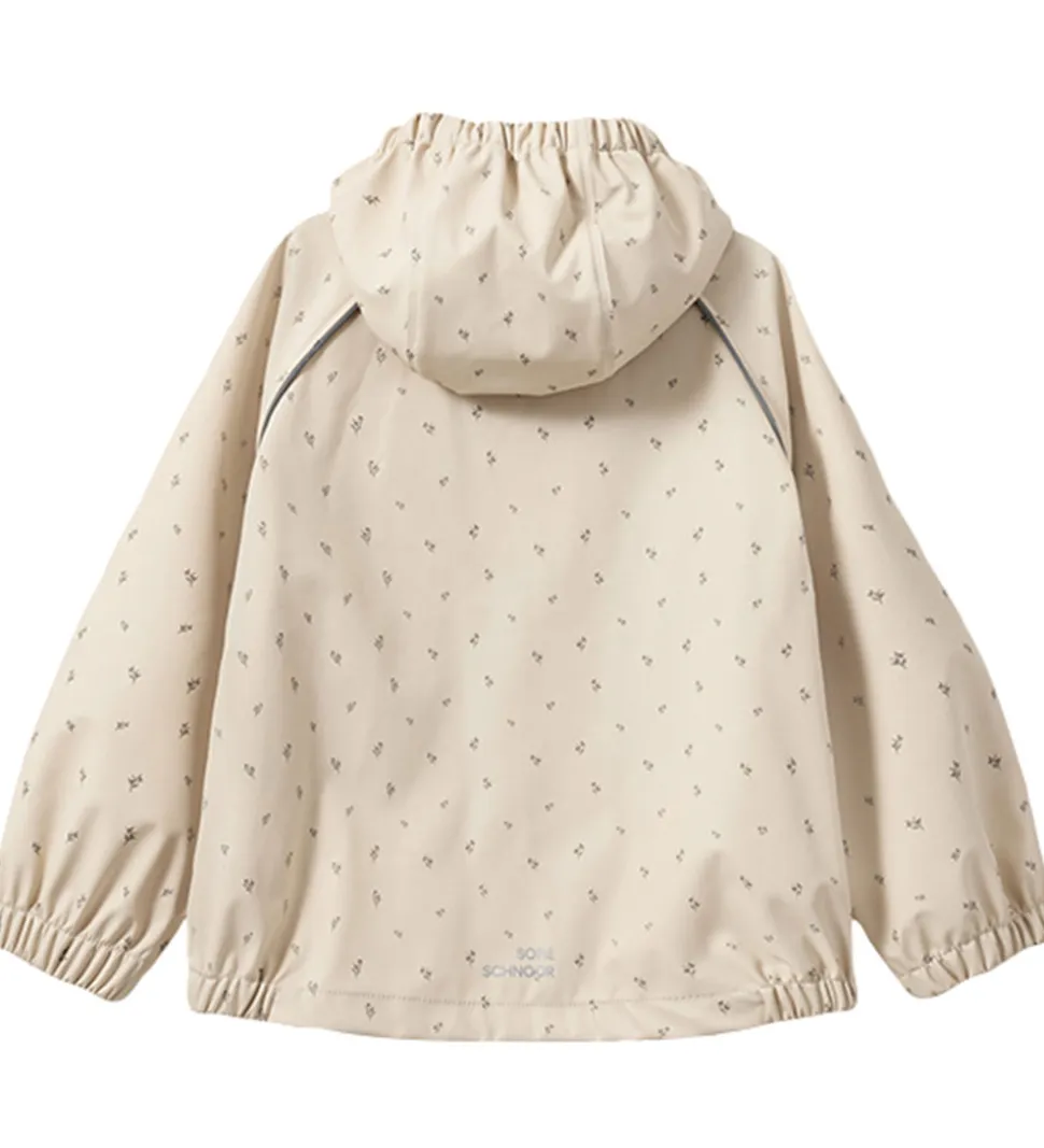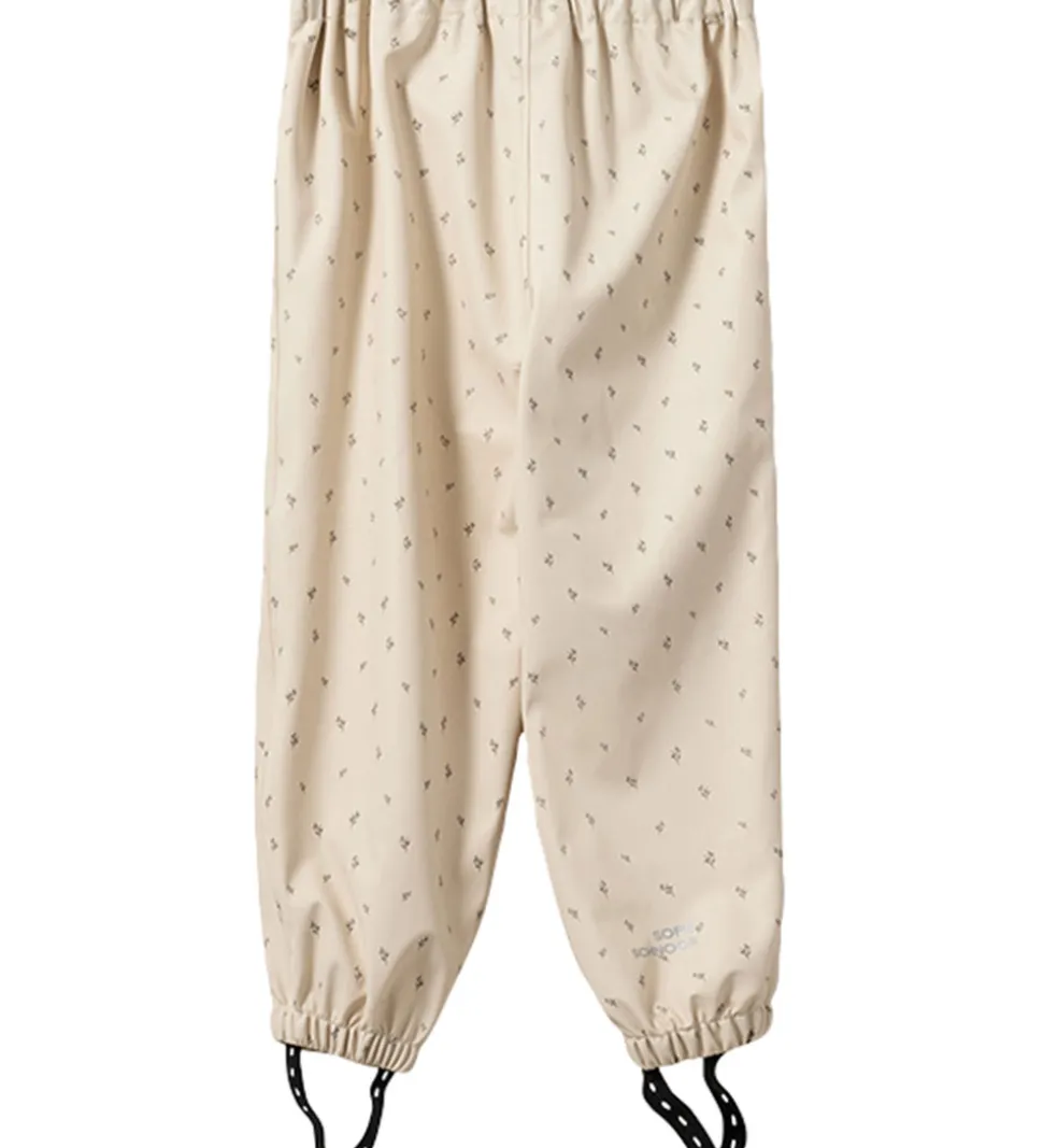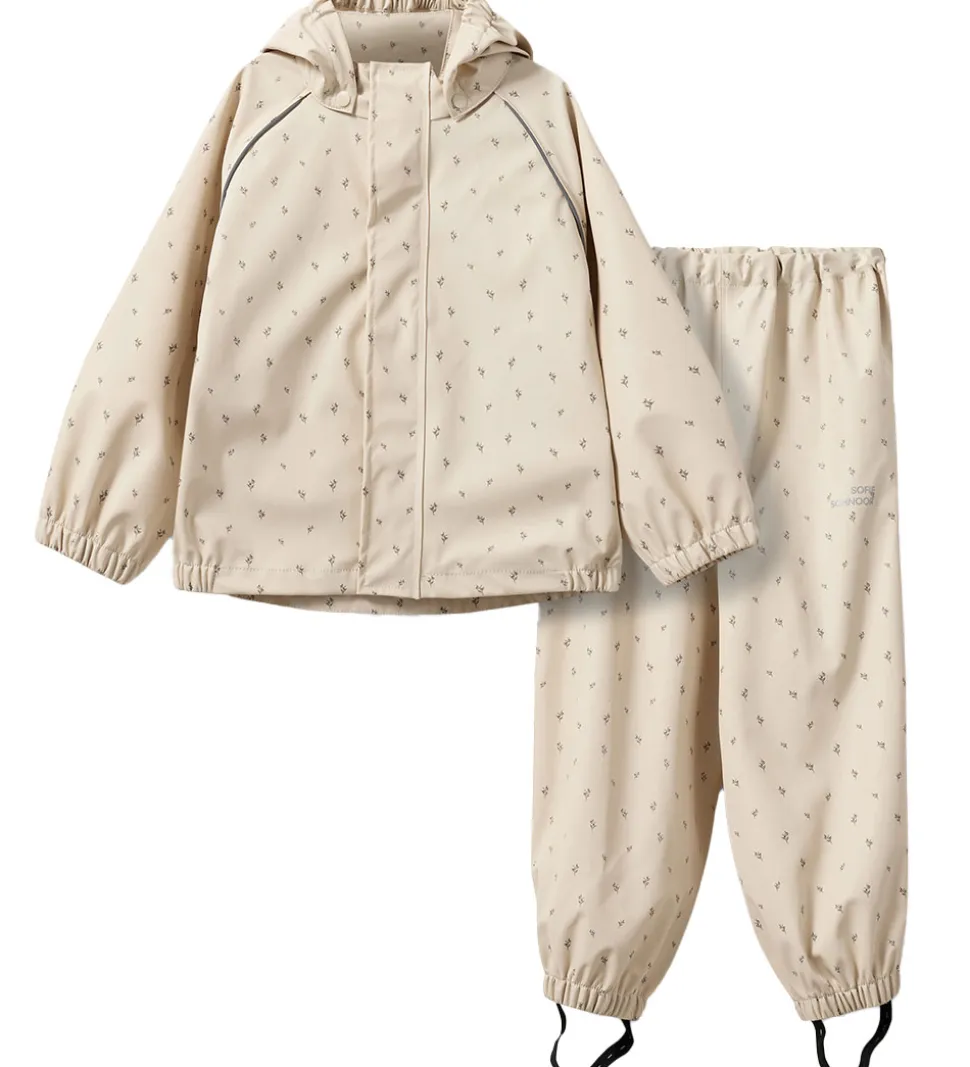 Fint Sofie Schnoor regntøj bestående af et par regnbukser og en regnjakke af PU i beige med et småblomstret alloverprint. Regntøjet er udstyret med reflekspipings og -logoprint.