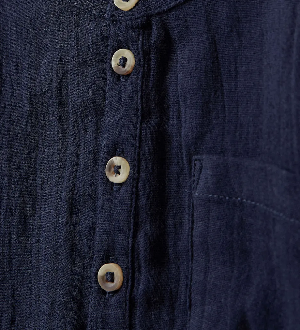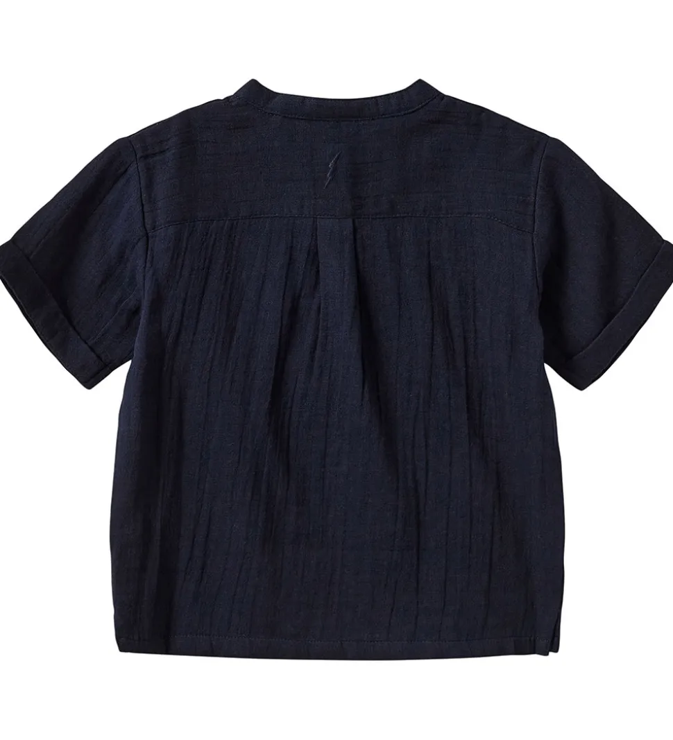 Sofie Schnoor skjorten har korte ærmer med fine fastsyet ombuk, og i halsåbningen er der en flot kinakrave. Fortil åbnes skjorten ned til midt på sjorten med knapper i en stolpelukning. Skjorten er i en blød, fastvævet bomuldskvalitet.