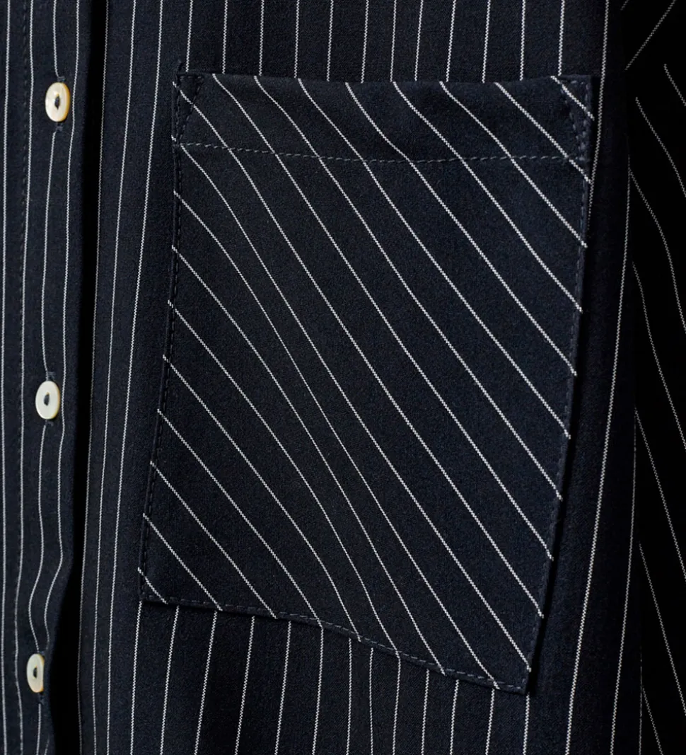 Stilfuld Sofie Schnoor skjorte med lange ærmer og en klassisk krave. Skjorten har et tidløst design med smalle hvide striber på en navy baggrund. Den er udstyret med en enkelt brystlomme, der tilføjer en ekstra detalje til det enkle udtryk. Skjorten har en løs pasform, hvilket ses i den afslappede silhuet.