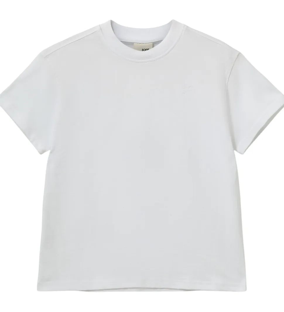 Elegant Sofie Schnoor t-shirt i en enkel hvid nuance med et diskret broderet logo på venstre bryst. T-shirten er designet med korte ærmer og en klassisk rund halsudskæring. Den fremstår med et stilrent look, der er let at integrere i garderoben.