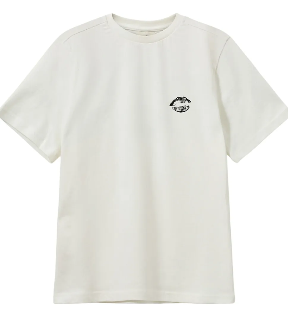Stilfuld Sofie Schnoor t-shirt i en klassisk hvid nuance. T-shirten har et diskret og elegant print af læber på venstre side af brystet, der tilføjer et moderne touch. Sofie Schnoor t-shirten har en rund halsudskæring med en smal ribkant, som giver en enkel og tidløs struktur.