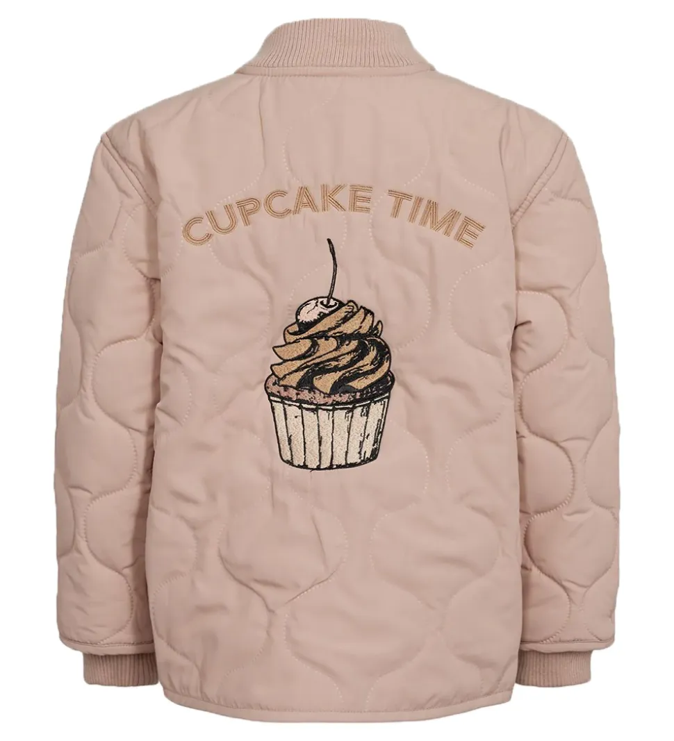 Skøn Petit by Sofie Schnoor termojakke i rosa med en broderet cupcake og teksten “CUPCAKE TIME” på ryggen. Termojakken er med en bølgende, quiltet struktur.