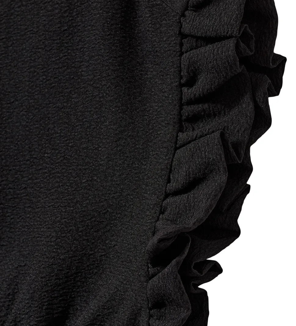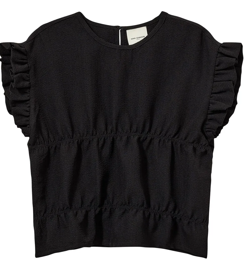 Flot Sofie Schnoor top i sort med dekorativ struktur i stoffet. Toppen har fine flæsekanter langs ærmegab og i taljen er der en isyet elastik, som giver en flot pasform. I nakken er der en slids med knap- og elastiklukning ovenover.