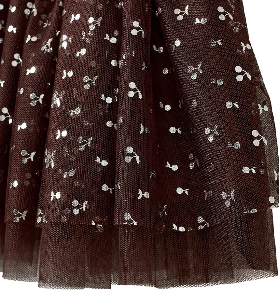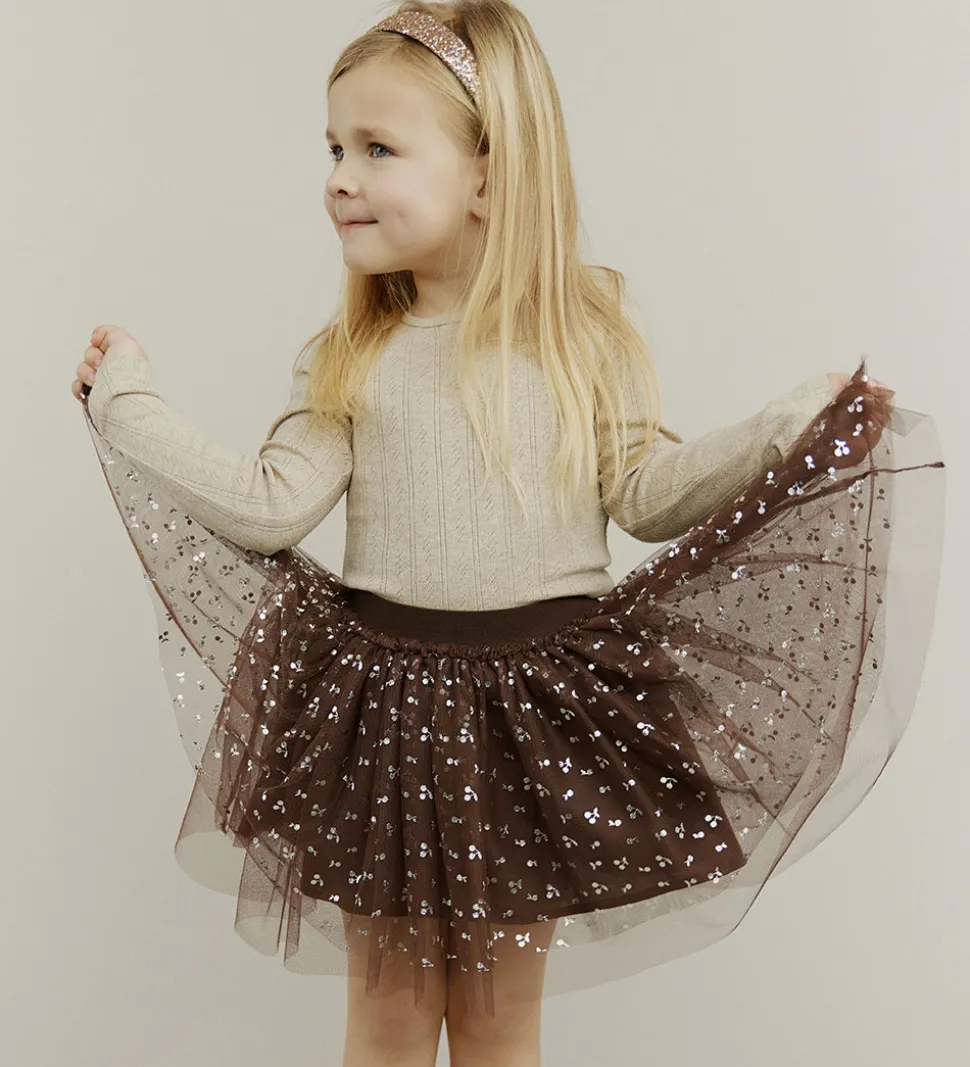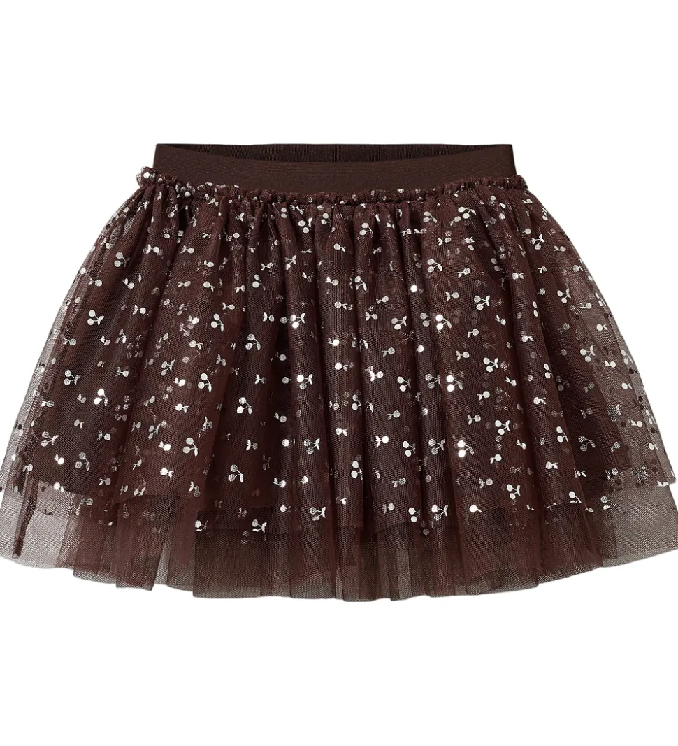 Elegant Sofie Schnoor tylnederdel i en dyb, rødbrun nuance med delikat kirsebærprint. Sofie Schnoor nederdelen har en luftig struktur med lagdelt tyl og en elastisk talje, der sikrer en smidig pasform.