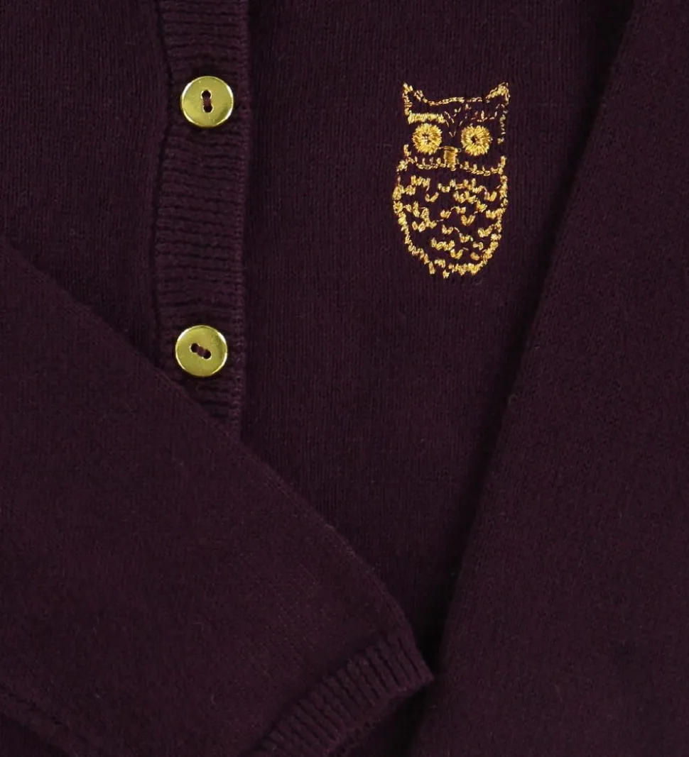 Lækker Soft Gallery cardigan i ensfarvet lilla med fine guld knapper, samt broderi af en guld ugle på venstre bryst.