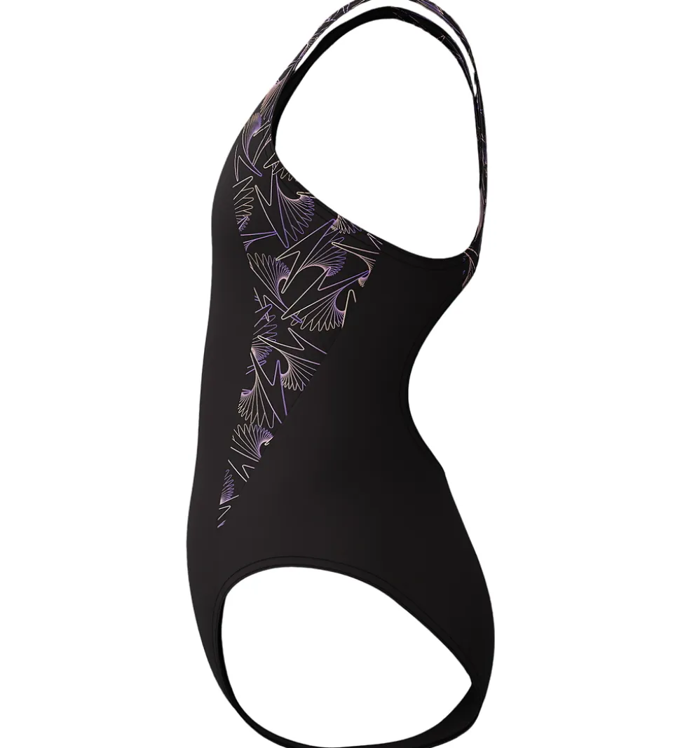 Smart Speedo badedragt i sort, og i siderne og på stropperne er der et flot mønster i lilla og rosa nuancer.
