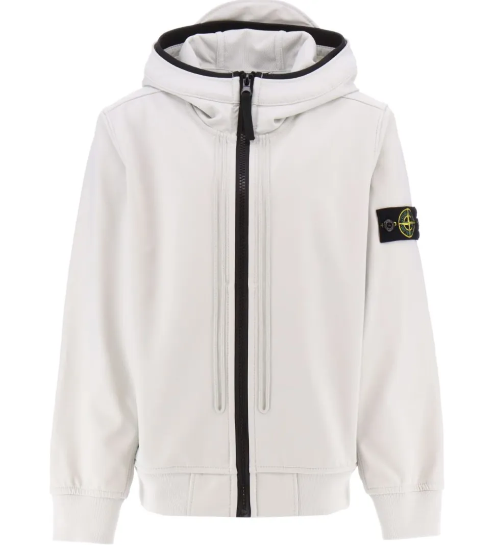 Stone Island softshelljakken har en fast hætte med en ribkant på indersiden samt en lille skygge, som skærmer for vind og vejr. Ærmerne og bunden af jakken har brede ribkanter.