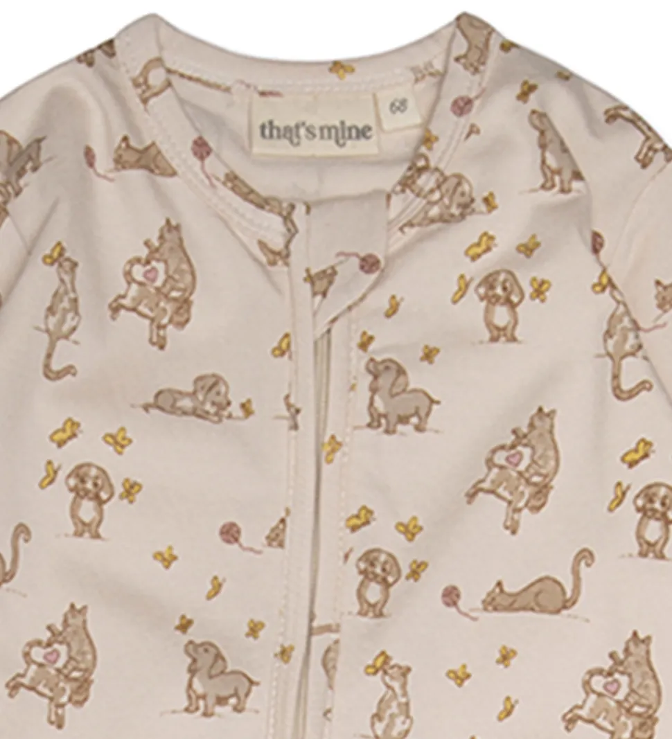 Pæn That’s Mine heldragt i rosa med et alloverprint af hundehvalpe og kattekillinger i rosa og beige farver.
