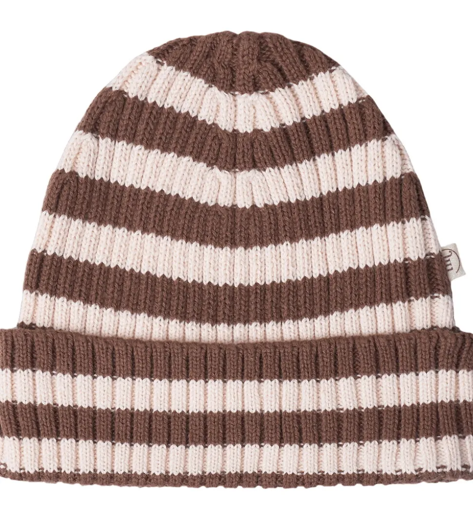 Indbydende hue fra Thats Mine i en stribet brun og rosa kombination. Huen har en struktureret ribstrik, der tilfører et enkelt og stilrent udtryk. Farverne er jævnt fordelt i symmetriske striber, hvilket giver et klassisk look.