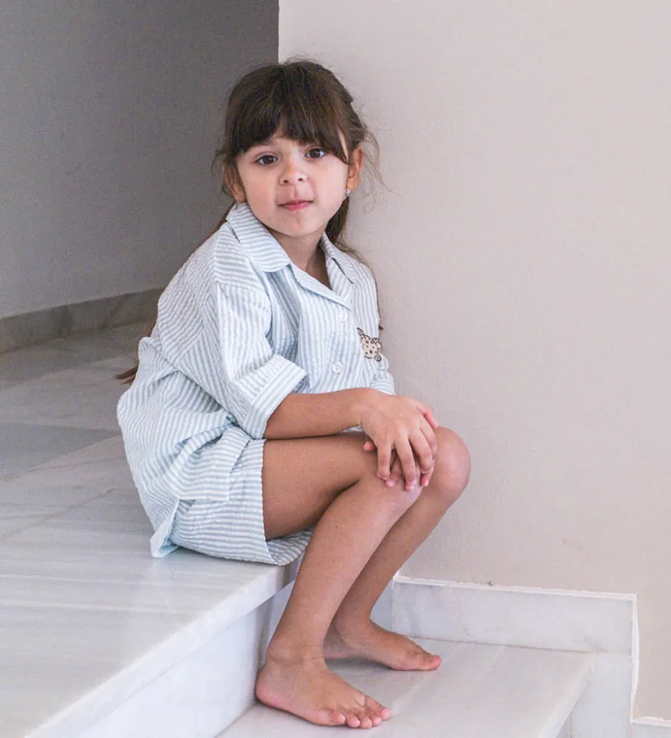 Charmerende Thats Mine skjorte med korte ærmer i en lys blå nuance med fine striber i hvid, og et sødt broderet print af en leopard på fronten. Skjorten har en klassisk krave og knaplukning, hvilket gør den ideel til varme dage.