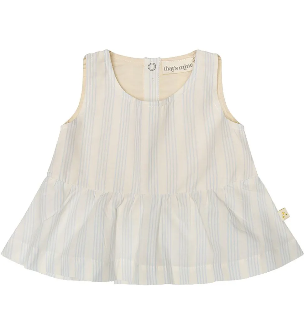 That’s Mine toppen har ingen ærmer men brede skulderstropper. I livet er der en syning ind, så toppen får et lille skørt i bunden med fine folder. Toppen åbnes i nakken med praktiske trykknapper, og den er i en let og fastvævet bomuldskvalitet.
