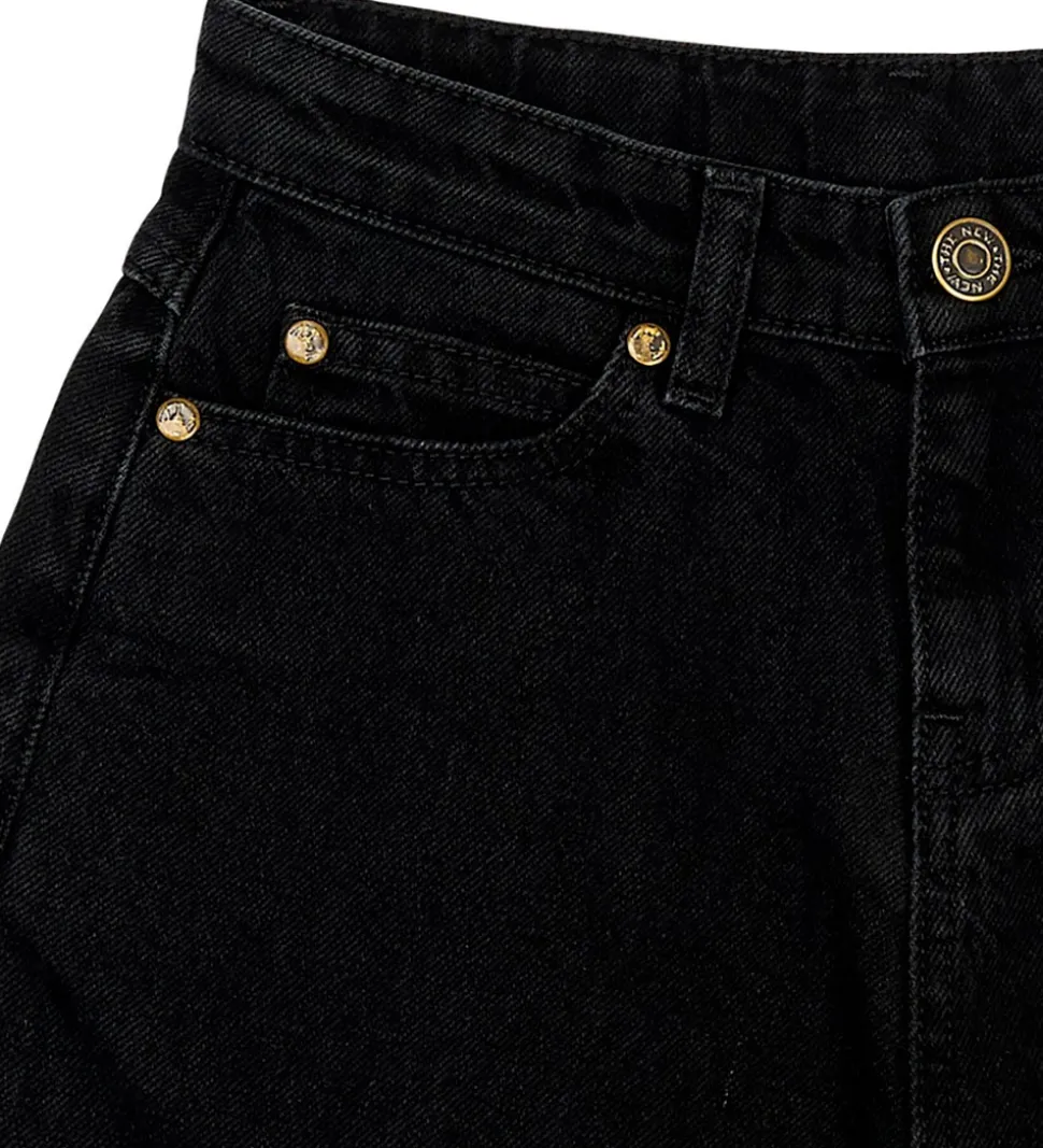 Stilrene The New jeans i sort denim. The New jeansene har elastik i taljen, som kan justeres med knapper indvendigt. De lukkes fortil med en hægte og lynlås. Jeansene har bæltestropper og lommer på for- og bagside. Jeansene har en løs pasform med lige ben.