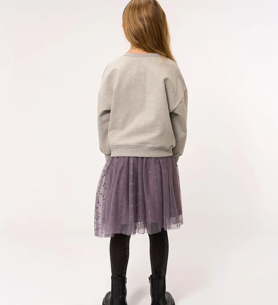 Yndig nederdel fra The New i støvet lilla tyl og med små sølvglimmer smileys over det hele. The New nederdelen har en elastisk talje, som sikrer en god pasform og har desuden et blødt og glatvævet underskørt, så den ikke fremstår gennemsigtig.