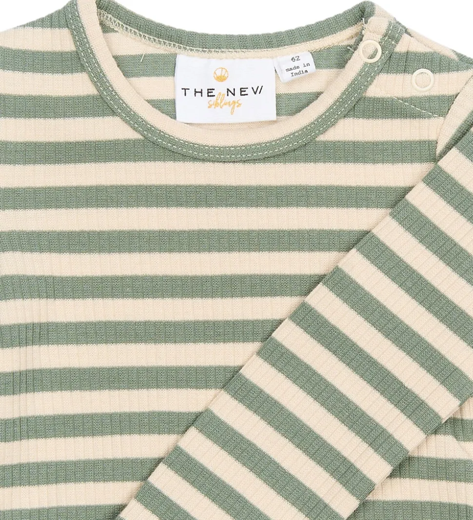 Elegant The New Siblings body med lange ærmer i et stilet grøn- og hvidstribet design. The New Siblings bodyen har en blød ribstruktur, som bidrager til en behagelig pasform.