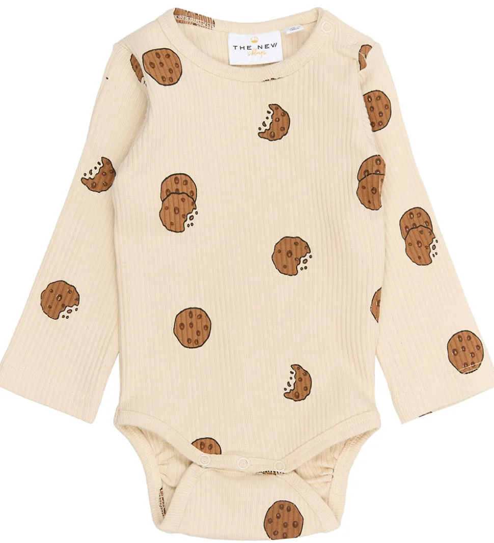Fin The New Siblings body i cremehvid med et sjovt småkagemønster i brun.