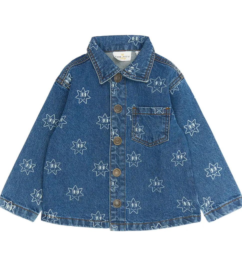 Smart denimjakke fra The New Siblings i blå denim med print af stjerner med glade ansigter. Denimjakken har en traditionel krave og trykknapper foran. Den har lange ærmer og et klassisk snit.
