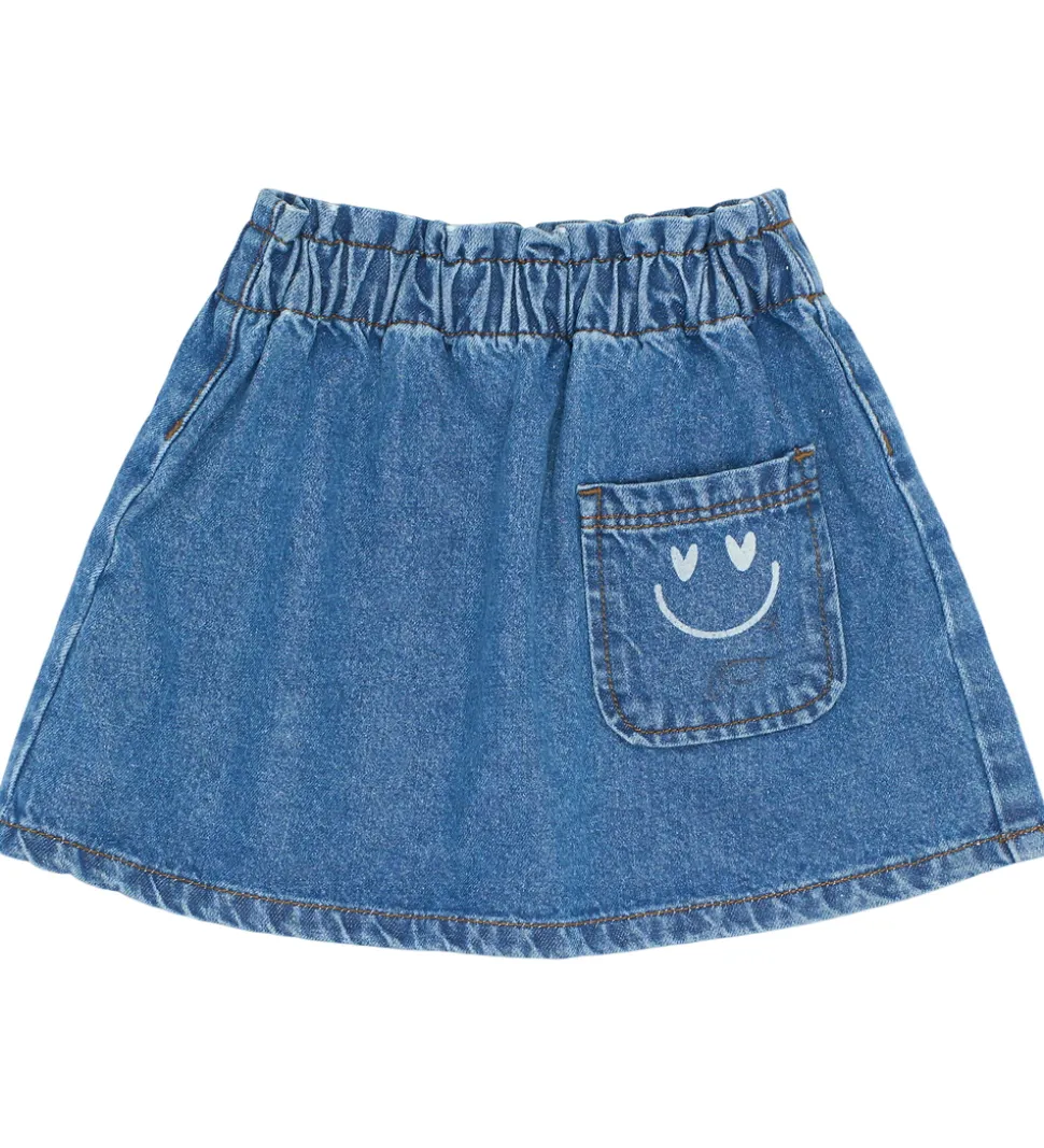 Sød nederdel fra The New Siblings i en skøn mellemblå denimkvalitet og med en fin åben lomme fortil med en smiley i en lysere blå tone. Nederdelen har et A-formet snit med en bred elastikkant i taljen, der kan justeres indvendigt med knapper.