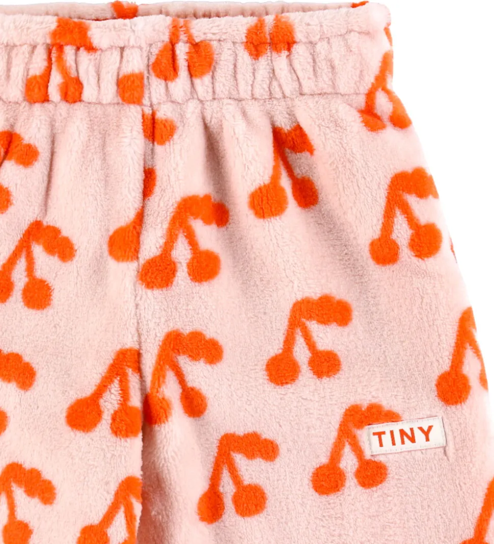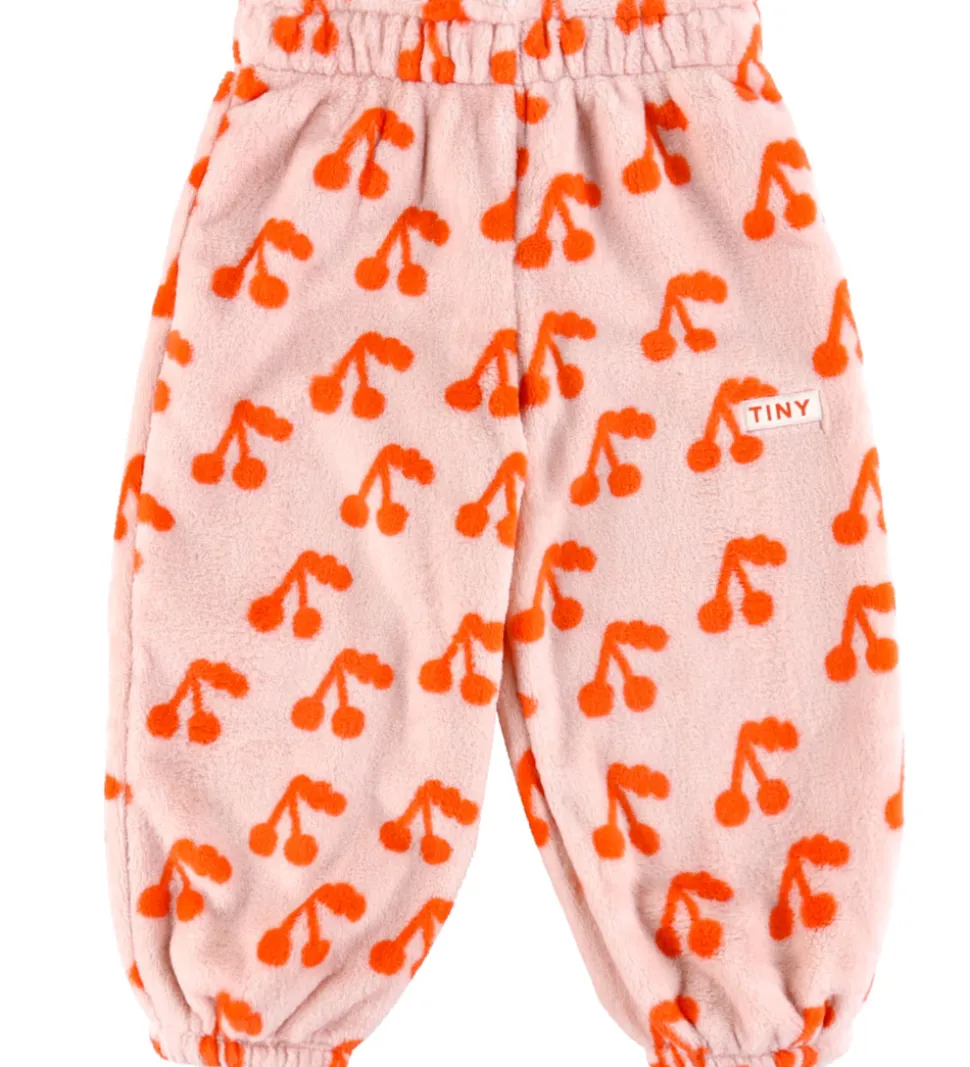 Dejlige Tiny Cottons fleecebukser i en blød, lyserød nuance med et mønster af orange kirsebær. Fleecebukserne har elastik i taljen og ved anklerne, og i livet kan de strammes ind med en snøre på indersiden. Et synligt logomærke på siden fuldender det stilfulde design fra Tiny Cottons.