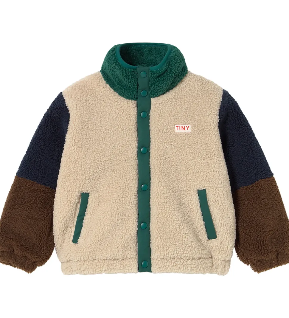 Indbydende fleecejakke fra Tiny Cottons af blødt teddyfleece, og i en flot farvekombination i beige, grøn, mørkeblå og brun. Den har en mellemhøj hals og lange ærmer med elastikkanter, der giver et stilfuldt udtryk.