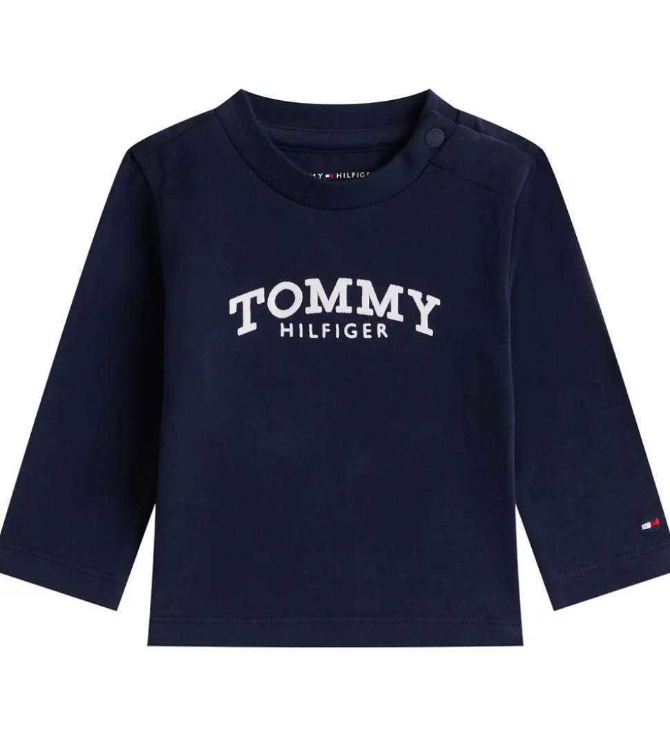 Stilfuld Tommy Hilfiger bluse i navyblå med et hvidt logoprint på fronten. Blusen har en rund halsudskæring med en smal ribkant og lange ærmer.