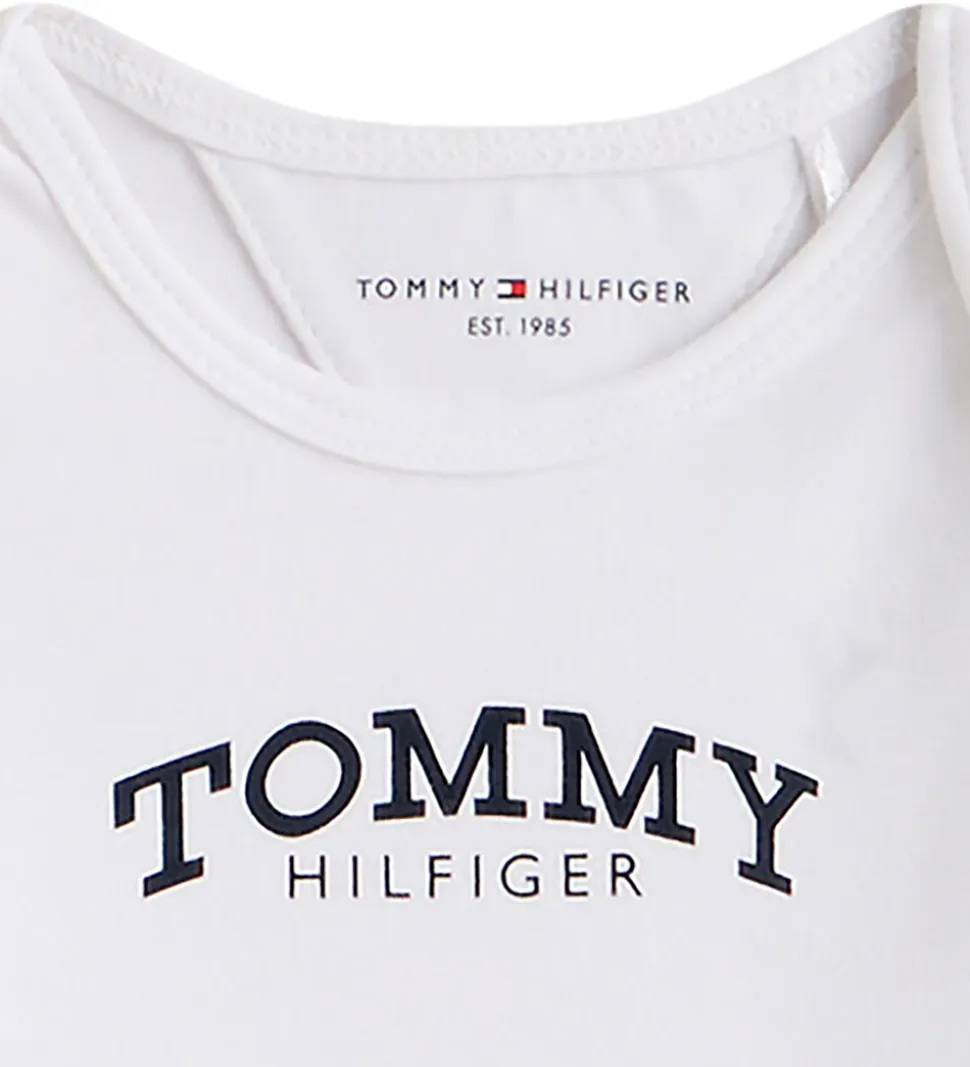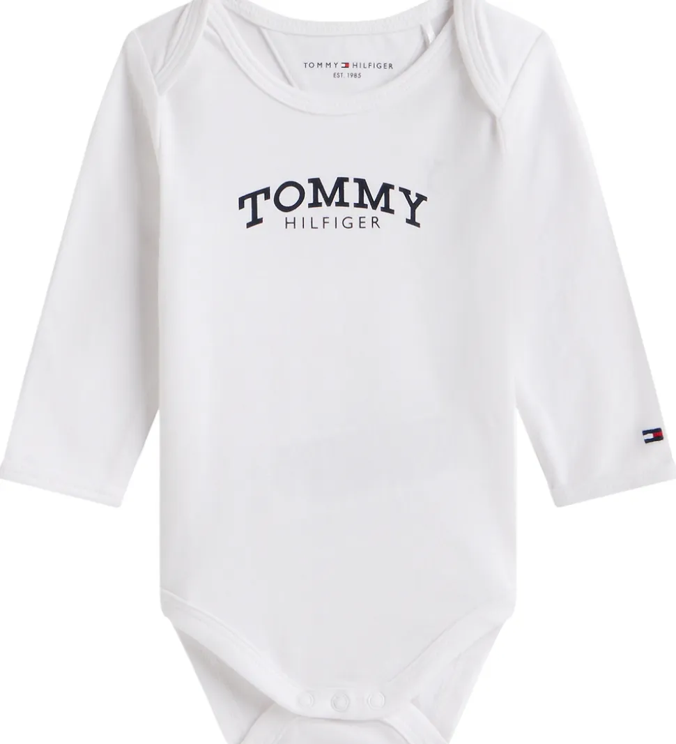 Elegant Tommy Hilfiger body i hvid. Den har et enkelt TOMMY HILFIGER print på brystet, der tilføjer et klassisk touch. Bodyen har en tætsiddende pasform med ribkanter ved hals og ærmer. Den har prakiske foldeskuldre og lukkes nemt med tre trykknapper i bunden for praktisk påklædning. Tommy Hilfiger logo synligt på venstre ærme.