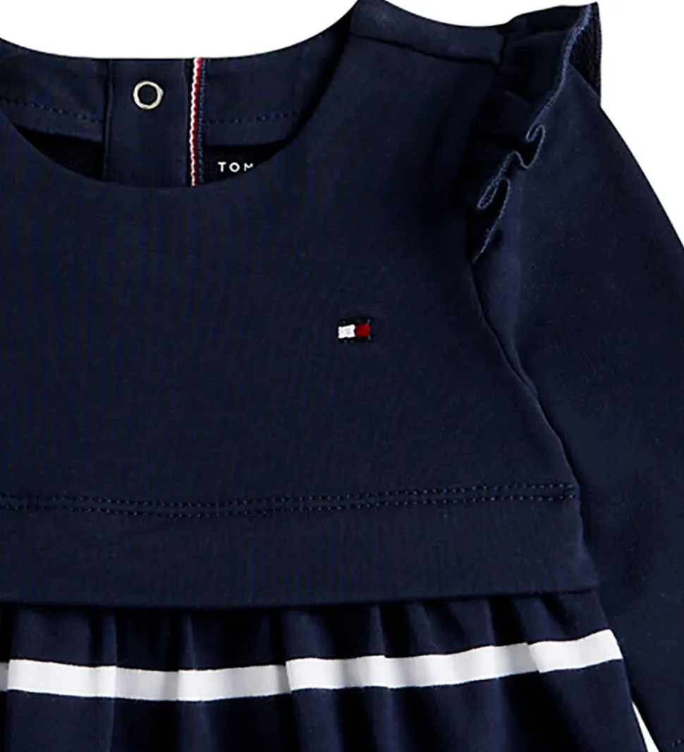 Elegant Tommy Hilfiger kjole i en mørkeblå farve. Kjolen har lange ærmer og fine flæsedetaljer ved skuldrene. Det nederste af kjolen er prydet med vandrette, hvide striber. Tommy Hilfiger kjolen har en rund halsudskæring og en diskret logoapplikation foran. I nakken findes tre trykknapper, som sikrer let af- og påklædning.