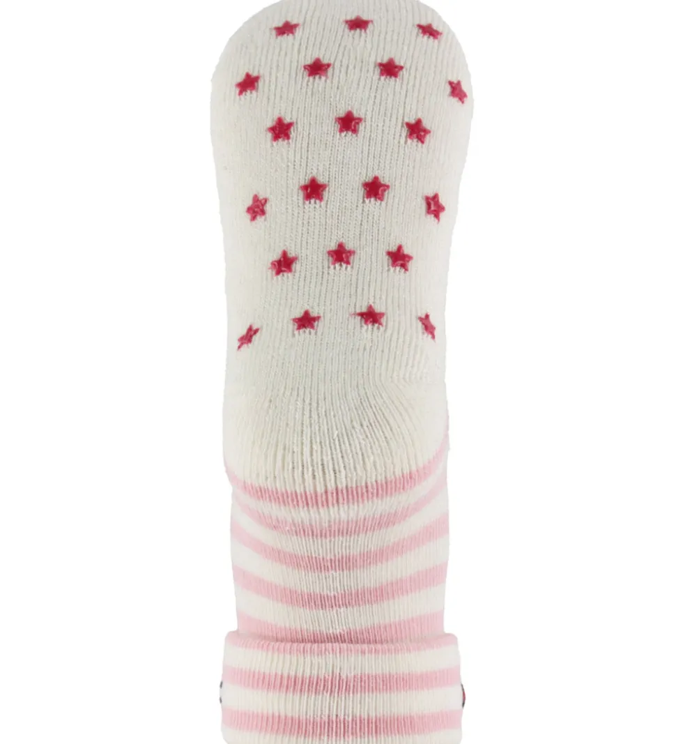 Charmerende Tommy Hilfiger strømper i en 2-pak med forskellige design. Et par er lyserøde med et enkelt “T” på siden, mens det andet par er stribet i hvid og lyserød. Tommy Hilfiger strømperne har en ribkant øverst for en god pasform. Strømperne har stjerneformede silikonedutter under fødderne, som giver et godt fodfæste.