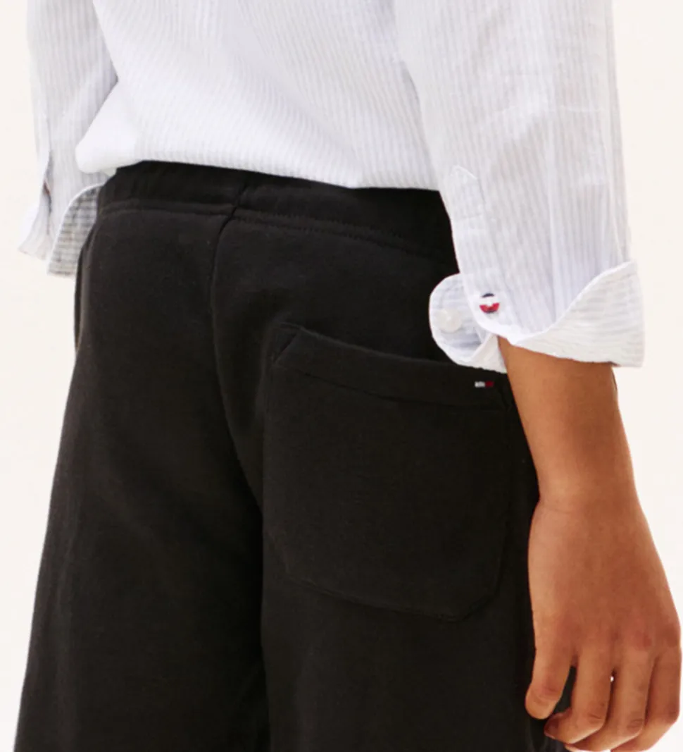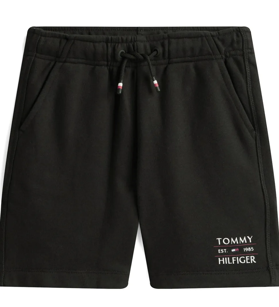 Lækre Tommy Hilfiger sweatshorts i sort med et hvidt logoprint på venstre lår. Sweatshortsene har en god elastik i taljen, som kan justeres med snøre fortil. Øverst er der en lomme i hver side og bagpå er der en lomme i højre side.