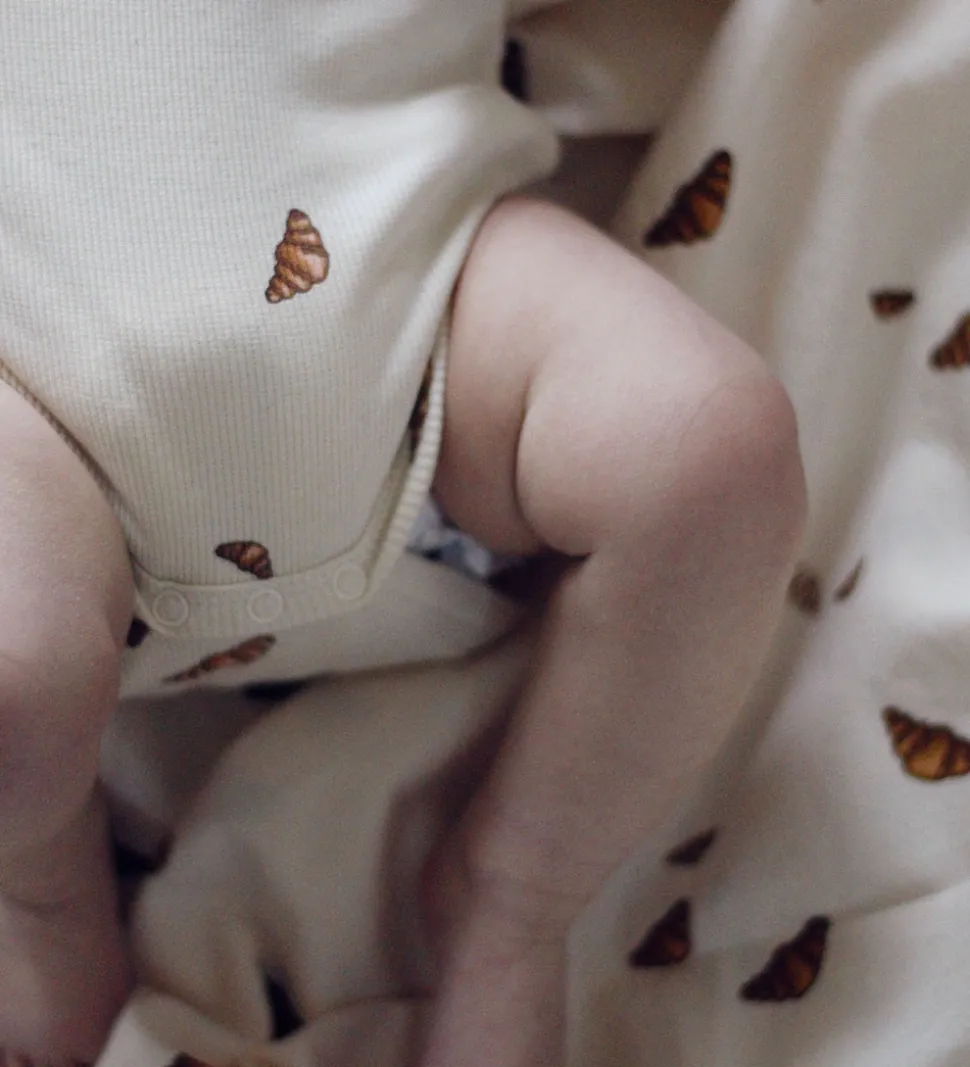 Charmerende VACVAC gaveæske, der indeholder en body, et par bukser og en hue i beige med et print med forskellige små croissanter i brune nuancer.