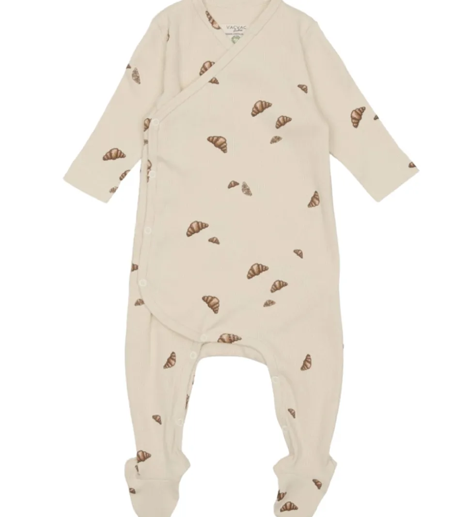Charmerende VACVAC heldragt med lange ærmer i en lys beige farve prydet med små croissant-print. Heldragten har et slå om-design, så den kan åbnes helt op på fronten. Heldragten lukkes ned ad højre side med trykknapper, og den kan åbnes mellem benene med trykknapper.
