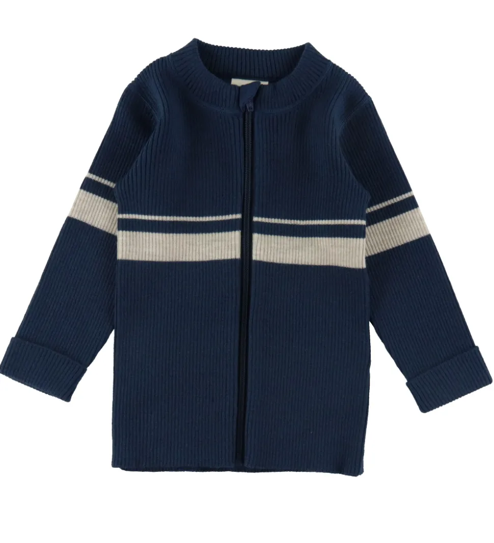 Dejlig Voksi cardigan i blå uld med to vandrette striber i hvid samt en flot, strikket ribstruktur.