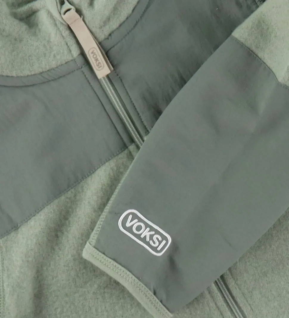 Praktisk fleecejakke af uld fra Voksi med lange ærmer i en lys grøn nuance og med detaljer af glatvævet nylon. Fleecejakken har en lynlås foran og Voksi-logoet på ærmet, hvilket giver et stilfuldt touch.