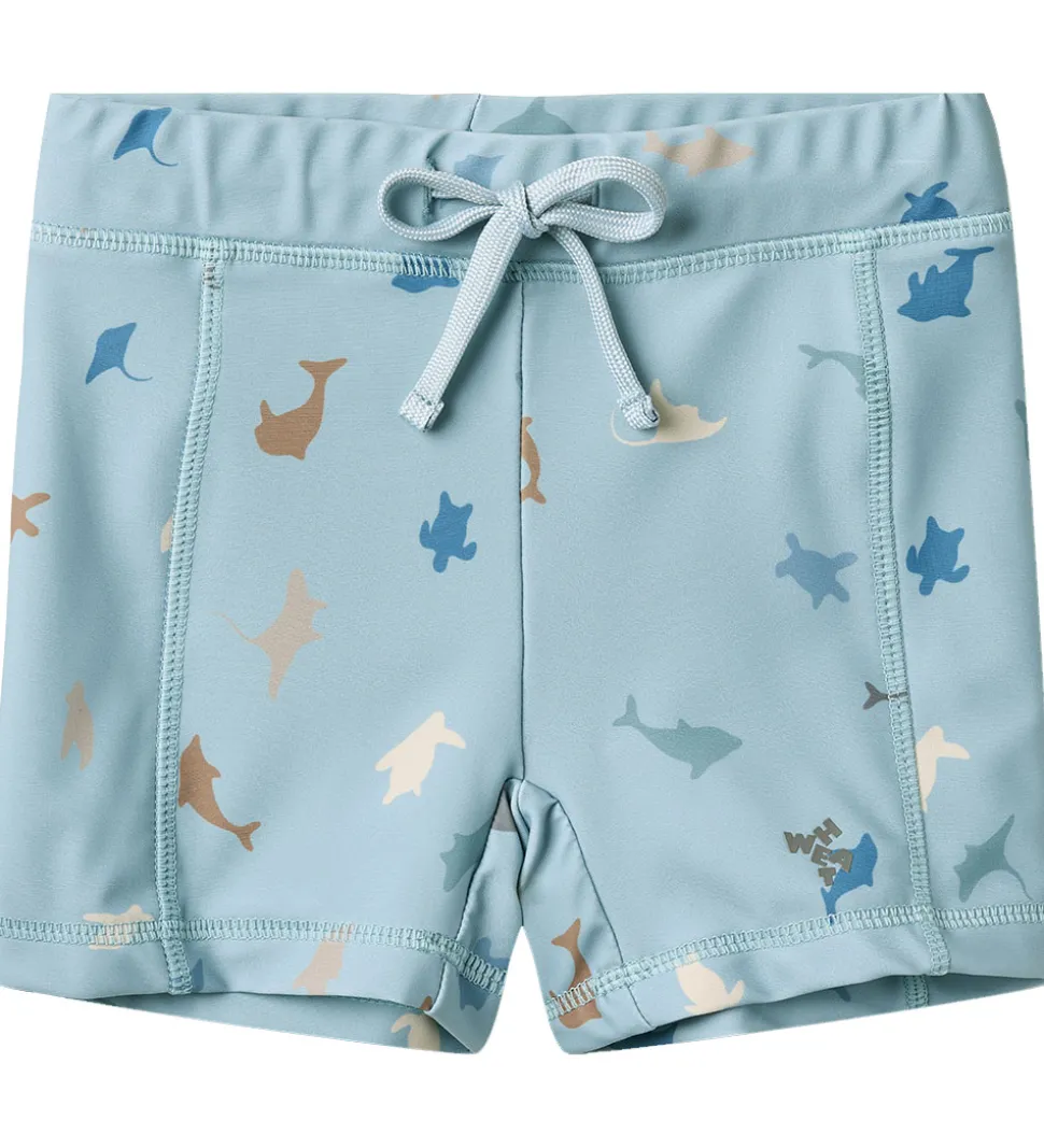 Flotte Wheat badebukser i en lyseblå nuance med et alloverprint af sjove havdyr som hajer og rokker i forskelligfarvede toner.