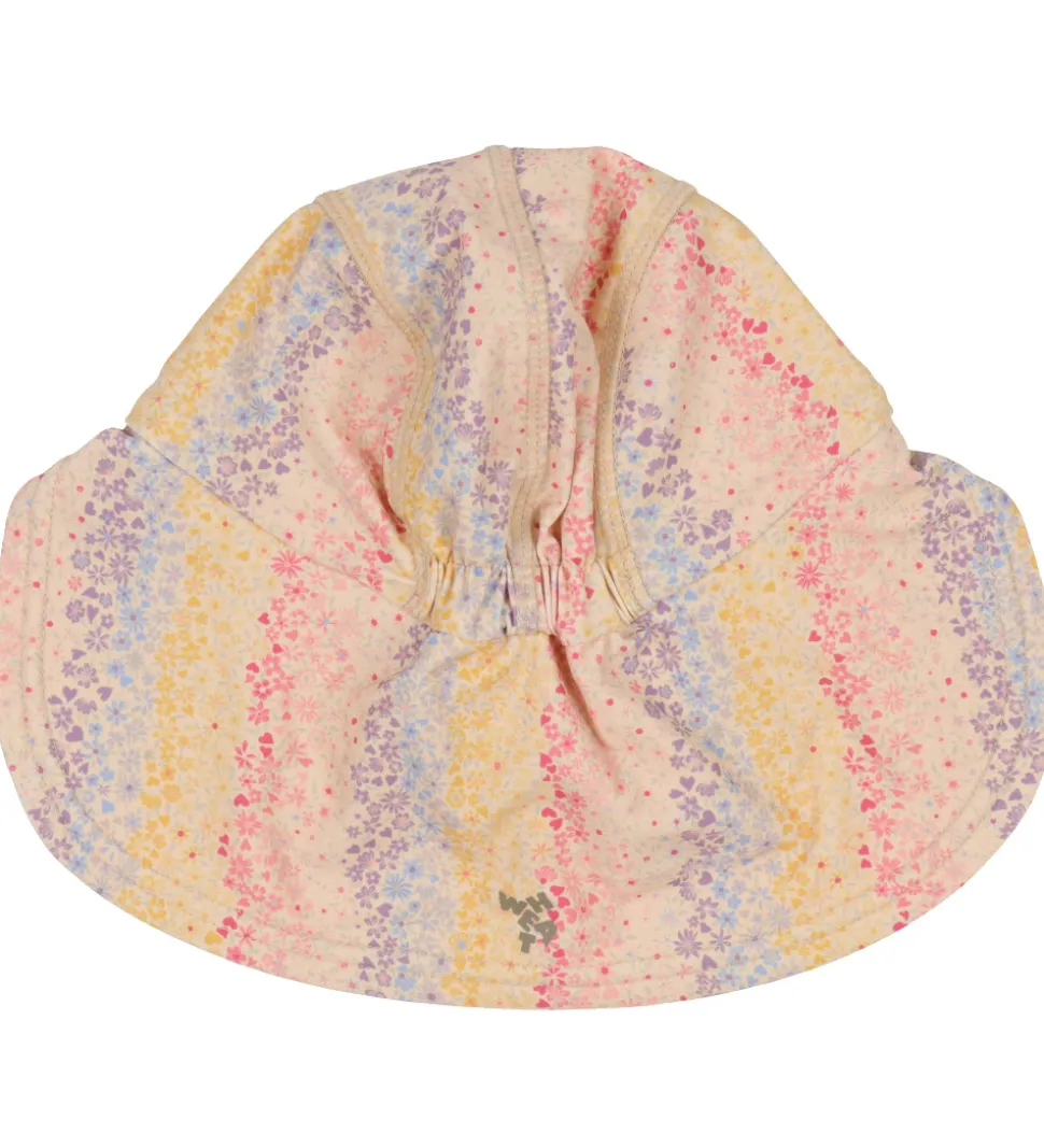 Fantastisk Wheat badehat i en lys, beige nuance, dekoreret med et mønster af delikate blomster i lyserøde, gule og lilla farver.