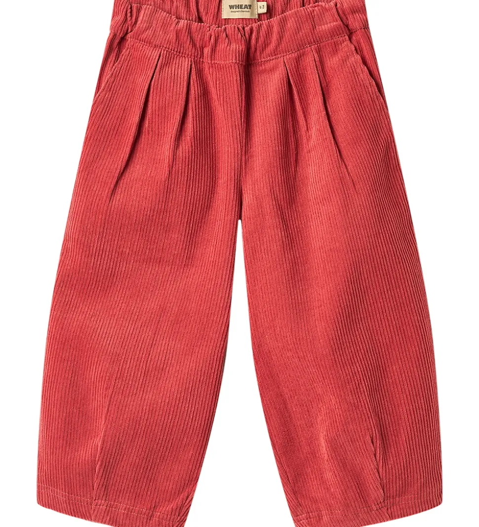 Smukke Wheat fløjlsbukser i en varm rød nuance. Wheat fløjlsbukserne har lange ben med en god vidde og en løs pasform, og i livet er der en bred, justebar elastikkant. I siderne er der praktiske lommer, og bagpå sidder der to store lommer.