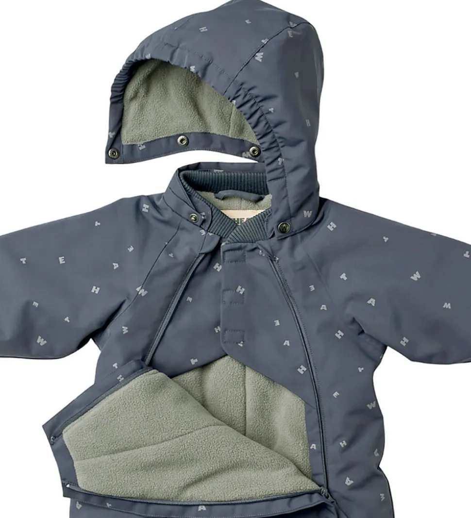 Sød Wheat flyverdragt i gråblå med alloverprint af bogstaver fra brandets navn. Flyverdragten rummer også både reflekspipings og -print.