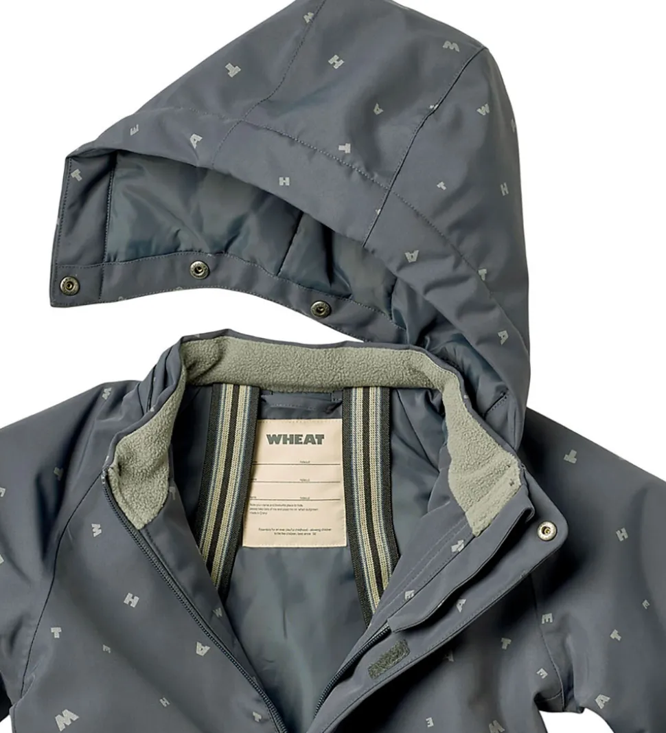 Skøn Wheat flyverdragt i gråblå med alloverprint af bogstaver fra brandets navn. Flyverdragten rummer også både reflekspipings og -print.