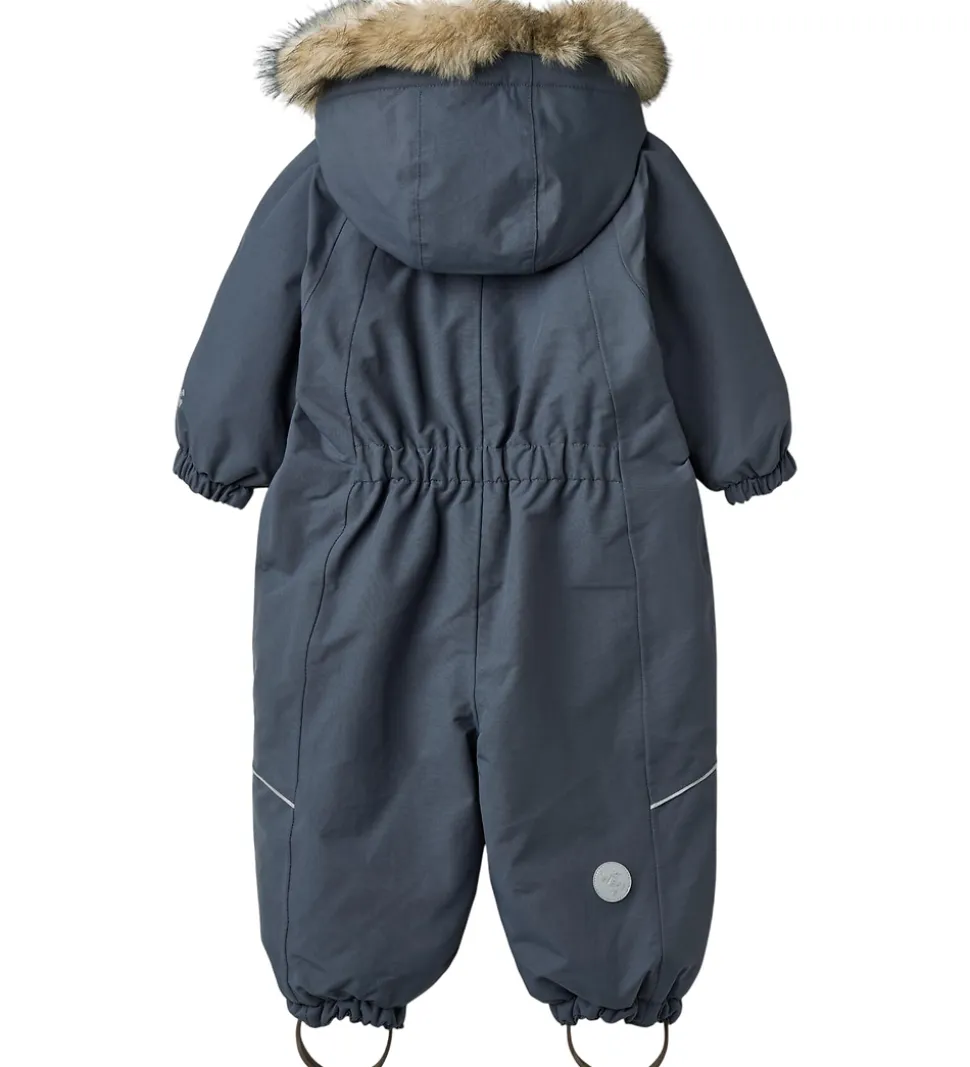 Skøn Wheat flyverdragt i gråblå og med en flot kant af imiteret pels på hætten. Flyverdragten rummer også både reflekspipings og -print.