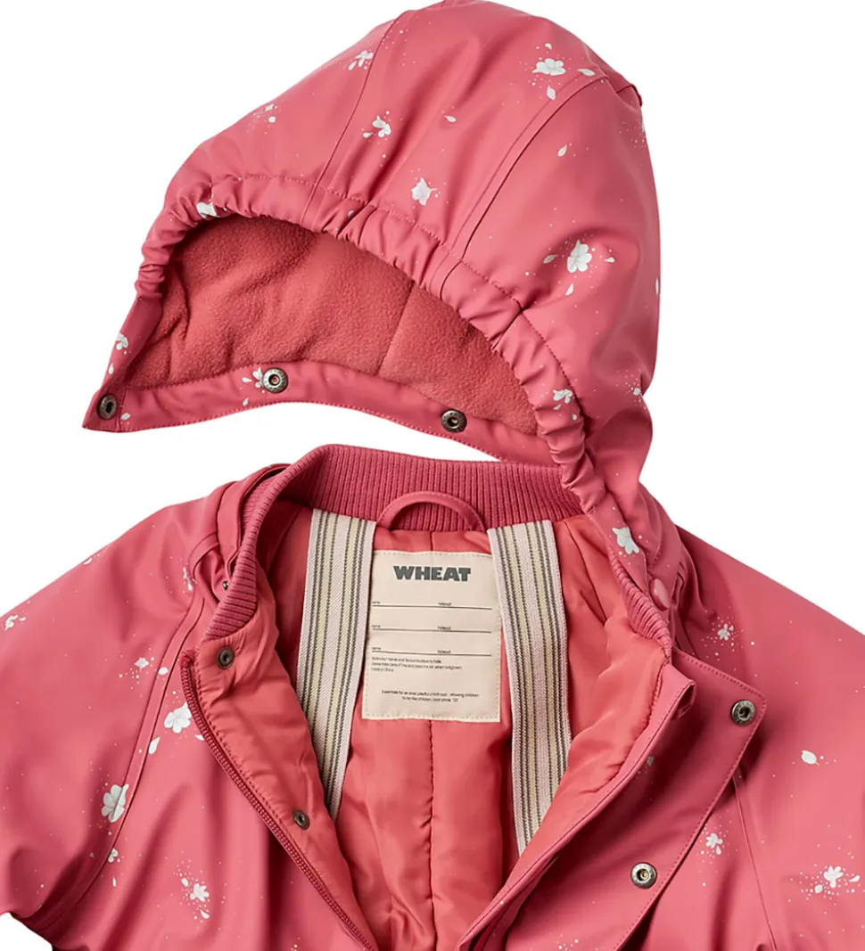 Wheat flyverdragten har lynlåsåbning med dobbelt vindstolpe, hvoraf den udvendige lukkes til med trykknapper. På fronten er der to tryknapslommer, og den har praktiske seler indvendigt. Flyverdragten har aftagelig hætte med trykknapper, og kan justeres med velcro på toppen. Der er ribkrave, som er behagelig for barnet at have tæt på huden.