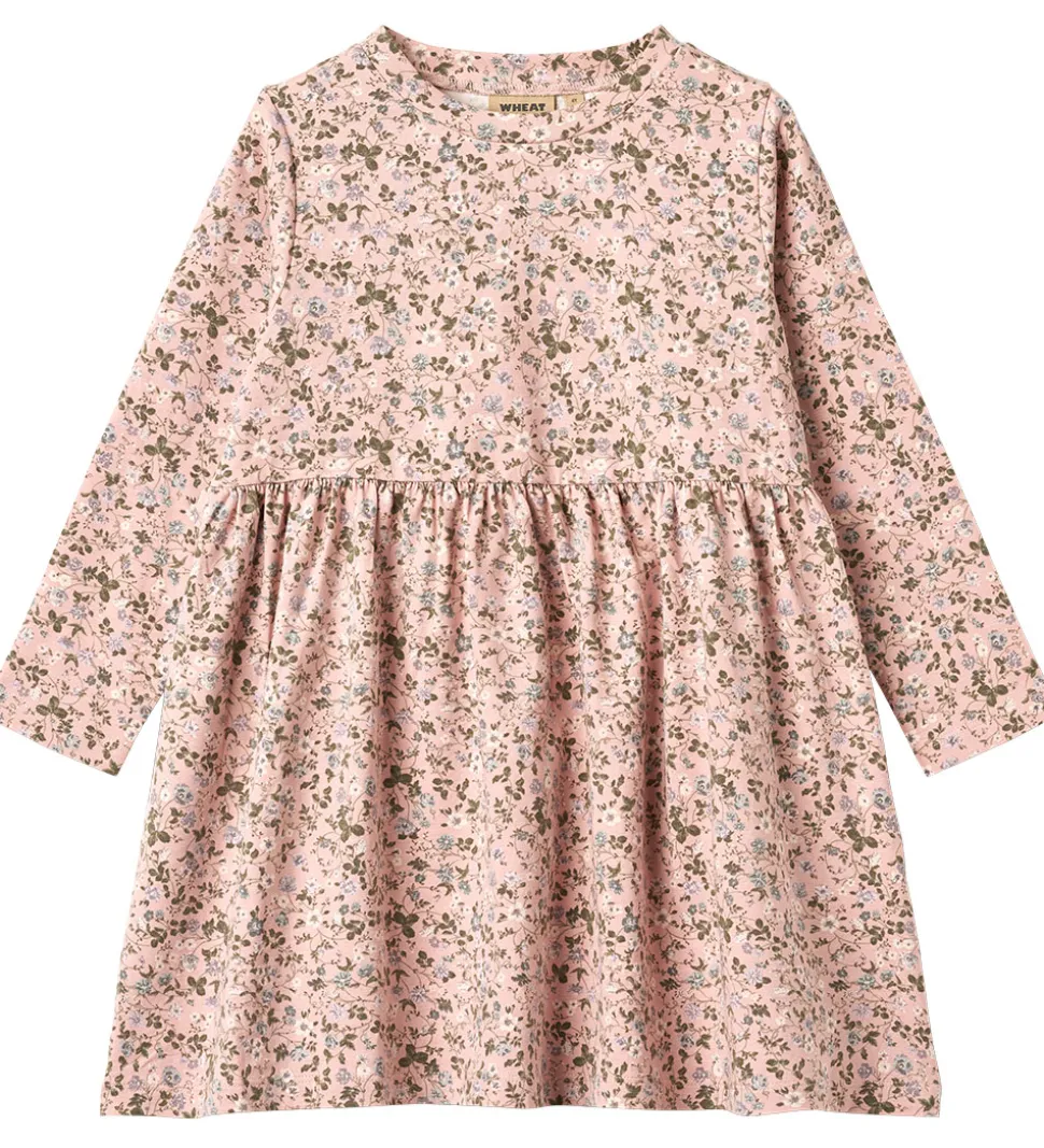Smuk Wheat kjole i lys rosa med et allover småblomstret print i hvide, grønne og blå nuancer.