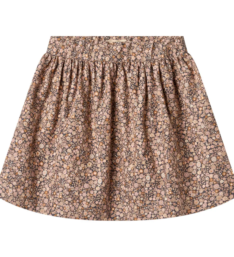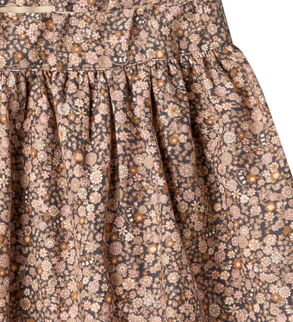 Elegant Wheat nederdel med et skønt alloverblomsterprint i bløde, rosa, brune og lilla nuancer på en let koksgrå baggrund. Wheat nederdelen har en flot pasform med en indvendigt justerbar elastikkant i livet, der giver en fleksibel og behagelig brug. Stoffet har en let og luftig struktur, der fremhæver nederdelens skønne fald.