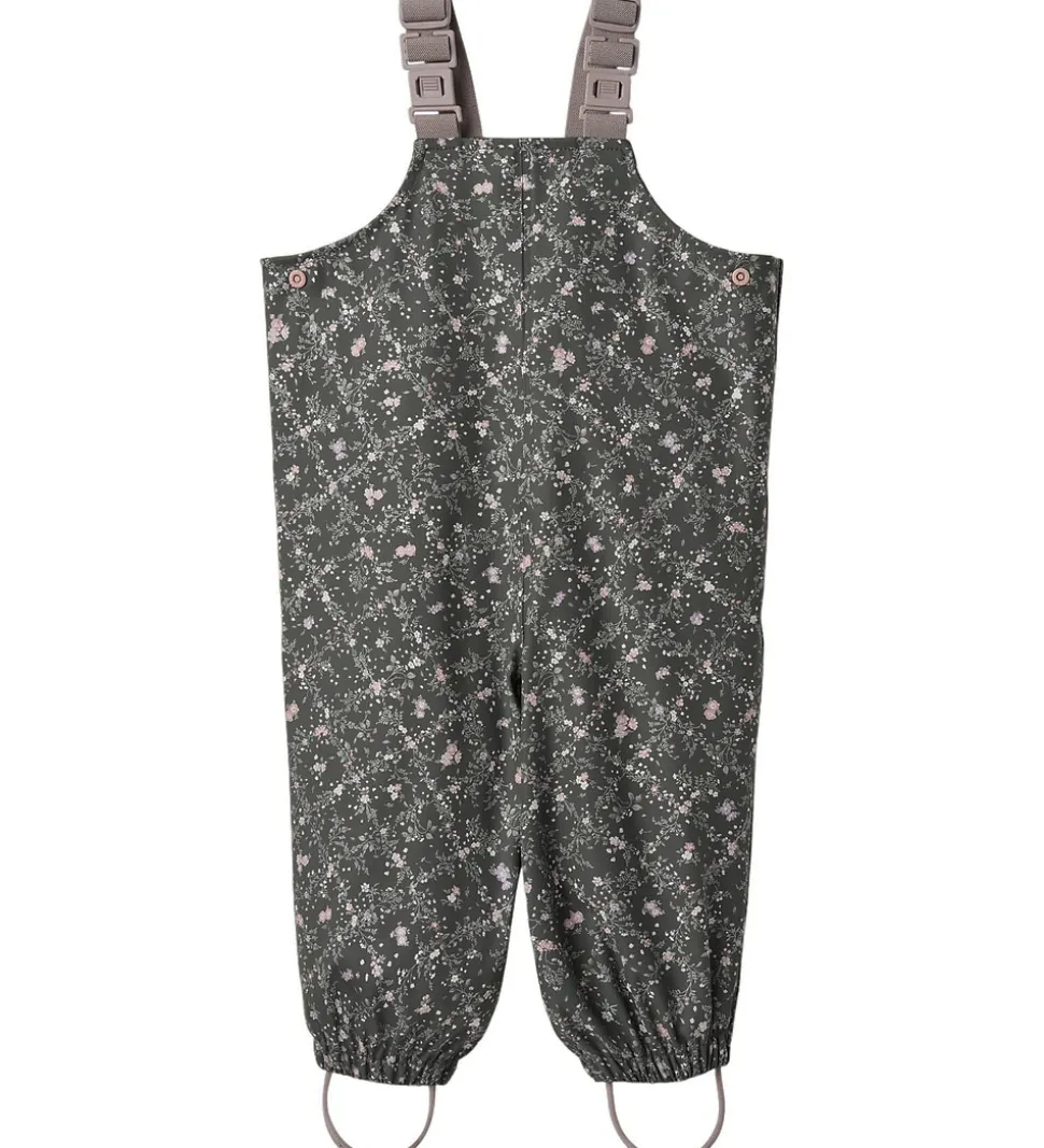 Flotte Wheat regnbukser af PU i mørk koksgrå med et småblomstret alloverprint i lilla, rosa og grønne nuancer.