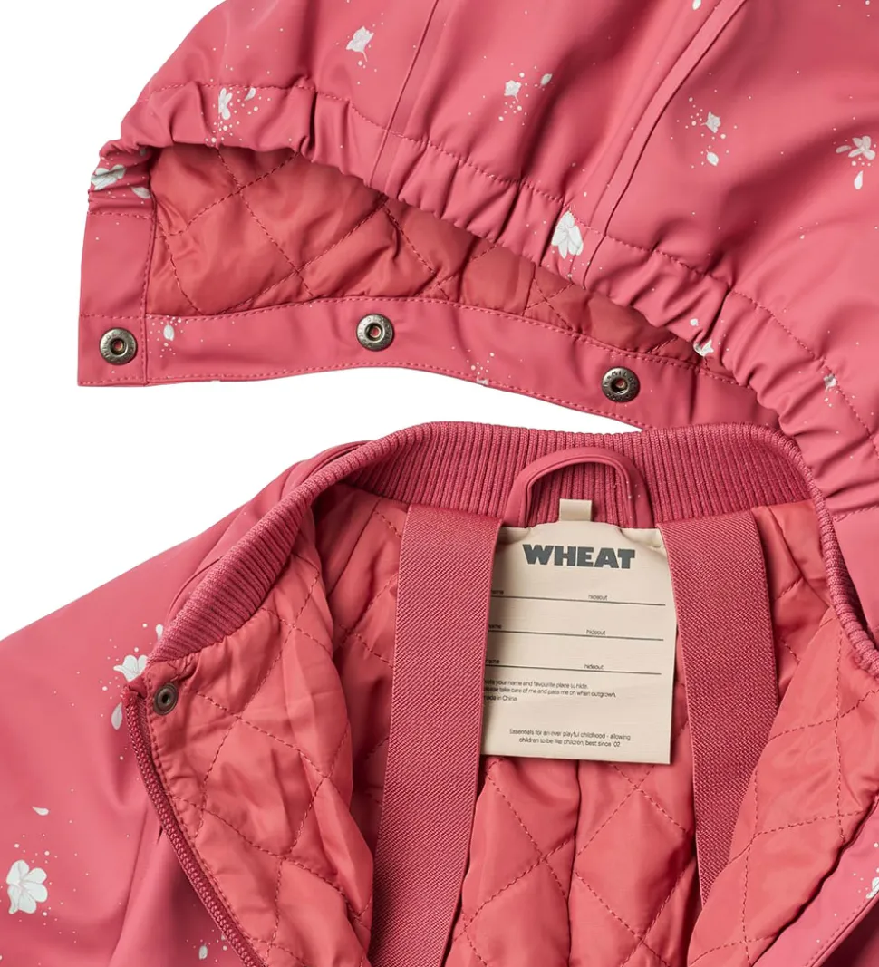 Wheat regndragten har ved håndleddene og omkring anklerne elastikkanter, og ved anklerne er der justerbare, og aftagelige gummistropper, der kan sættes under fodtøjet. Regndragten har en aftagelig hætte, som fastgøres med trykknapper og har en elastikkant i toppen af ansigtsåbningen, samt en hagebeskytter ved lynlåsen. Regndragten har to lommer fortil, der lukkes med en trykknap.