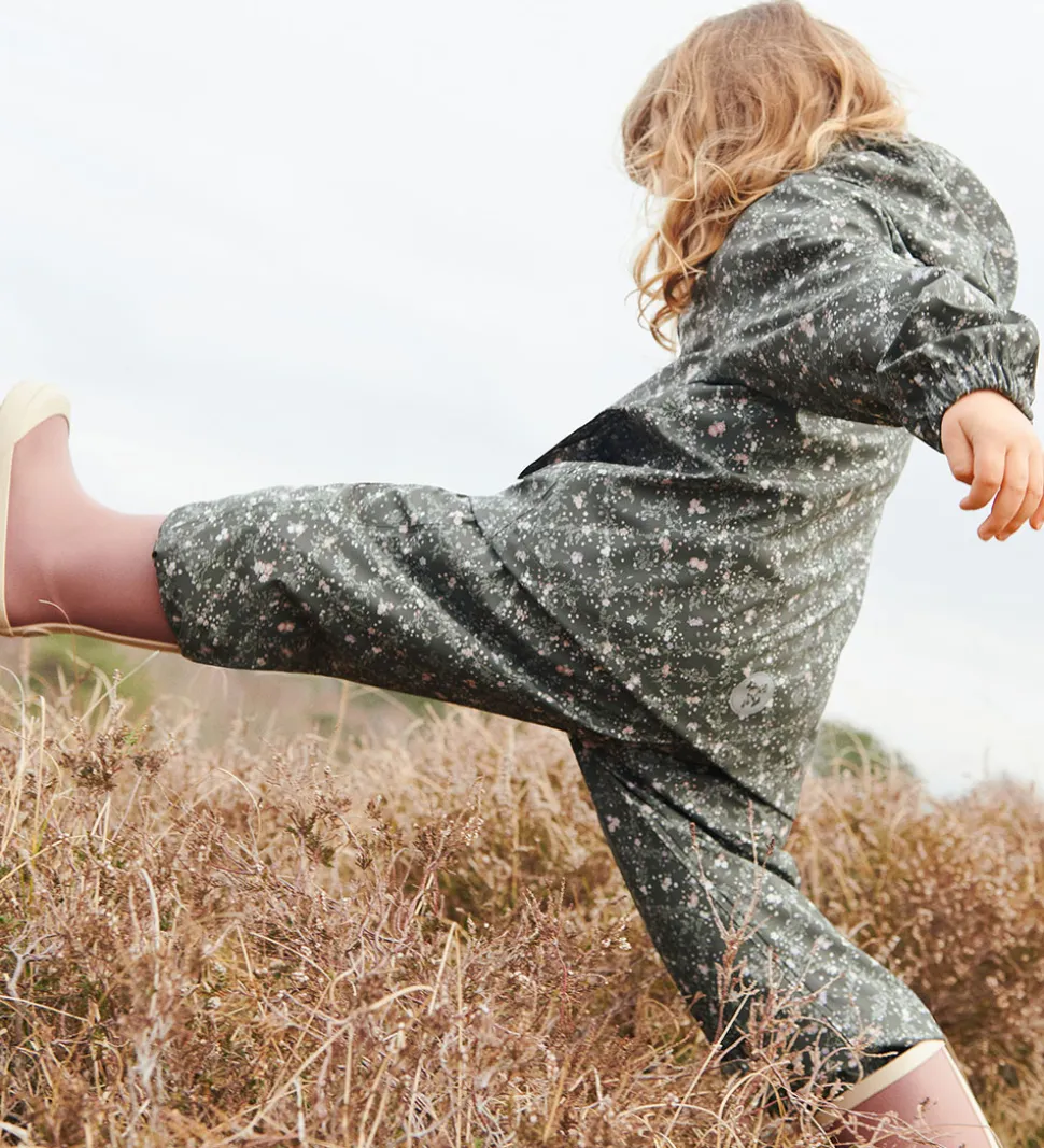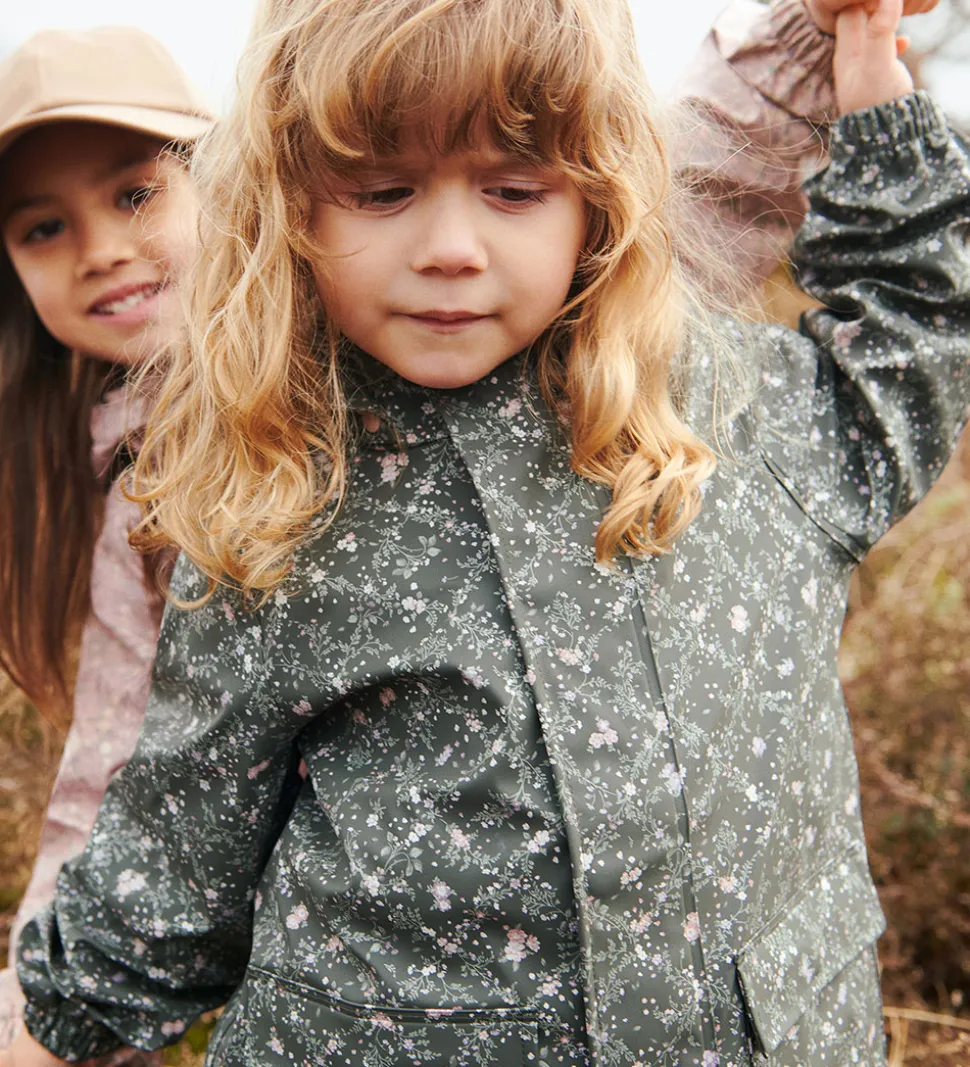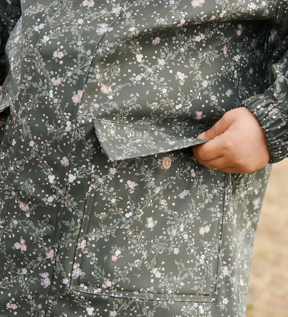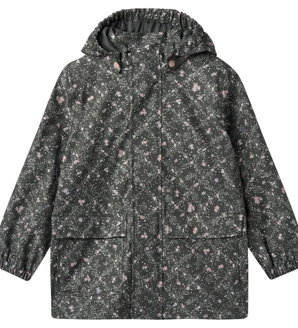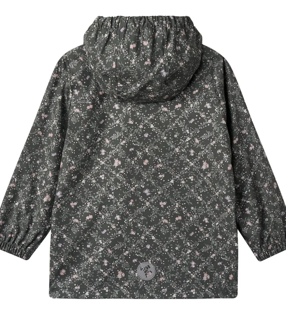 Skøn Wheat regnjakke af PU i mørk koksgrå med et småblomstret alloverprint i lilla, rosa og grønne nuancer.