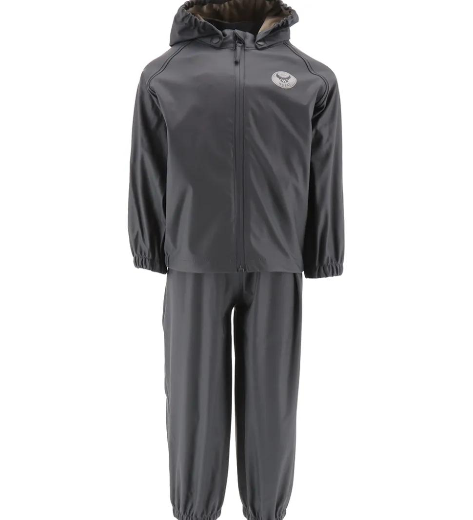Regntøjet har en blød, beige inderside. Bag på højre bukseben, nederst på ryggen og på regnjakkens bryst i venstre side er der praktiske refleksprint.