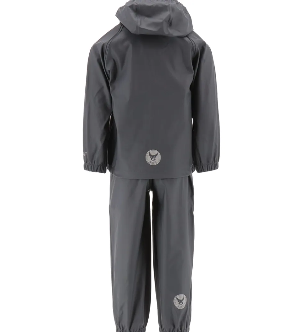 Skønt Wheat regntøj i navyblå PU. Regntøjet består af en regnjakke og et par regnbukser med seler.